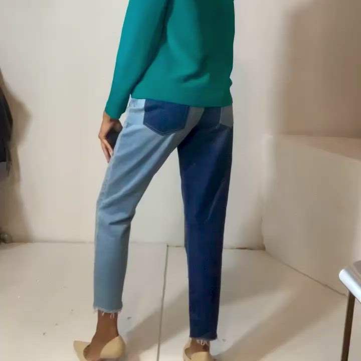 High waist color blocked jeans, with frayed hem.