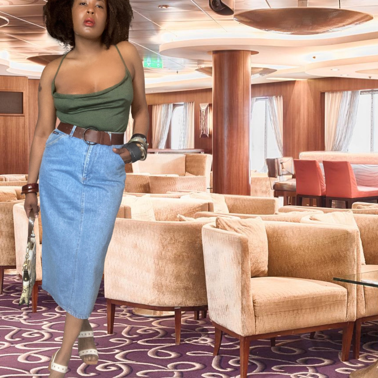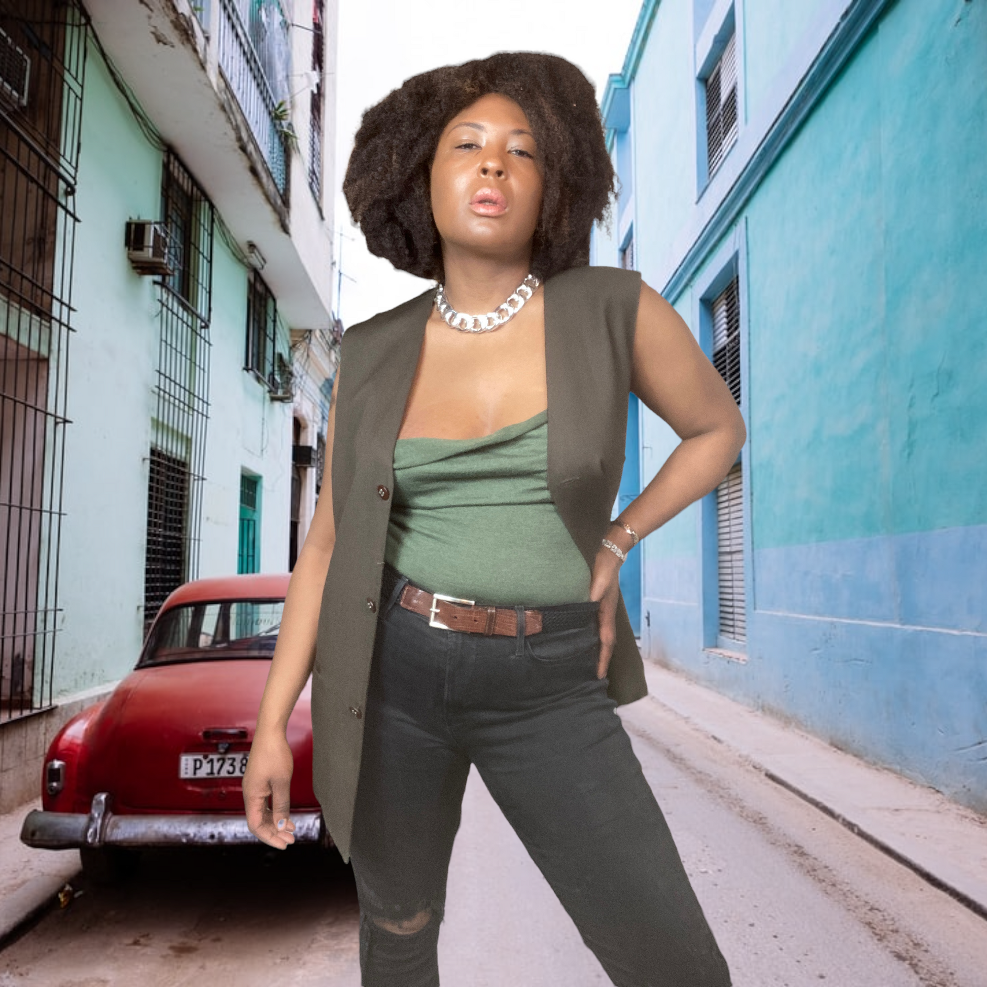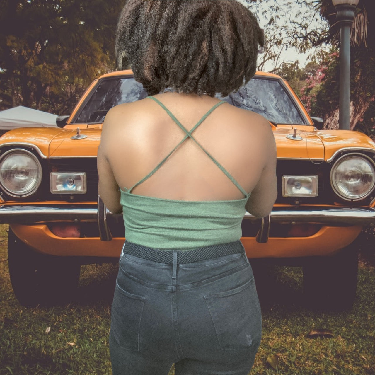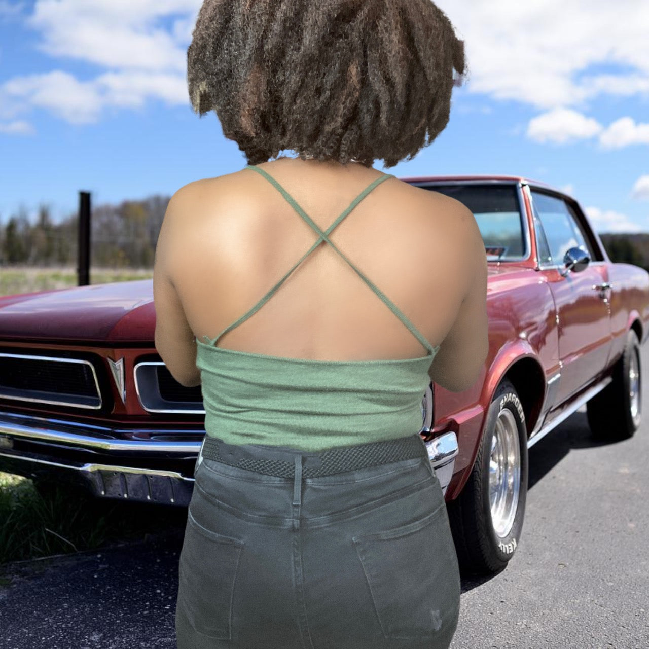 Amazing olive green Cashmere cowl draped halter top, with criss cross straps. It still has original tags attached, I would say likely a showroom sample, as it is a little stretched out, some alterations suggested for best fit.