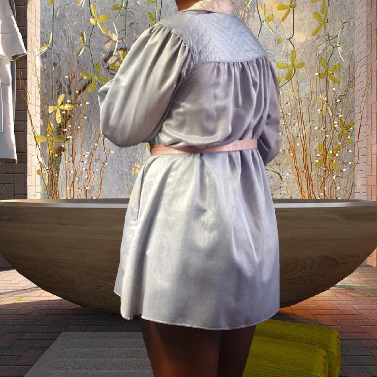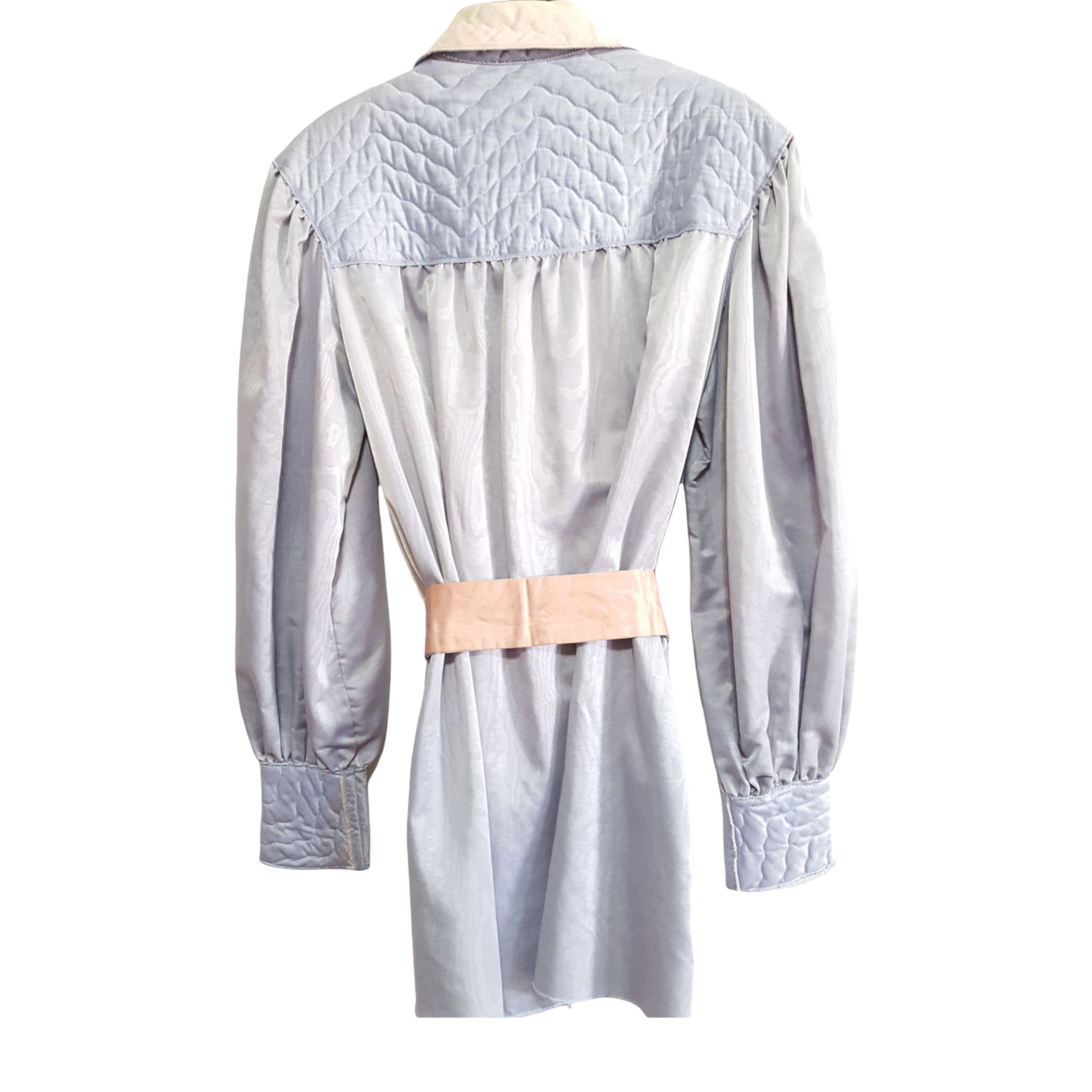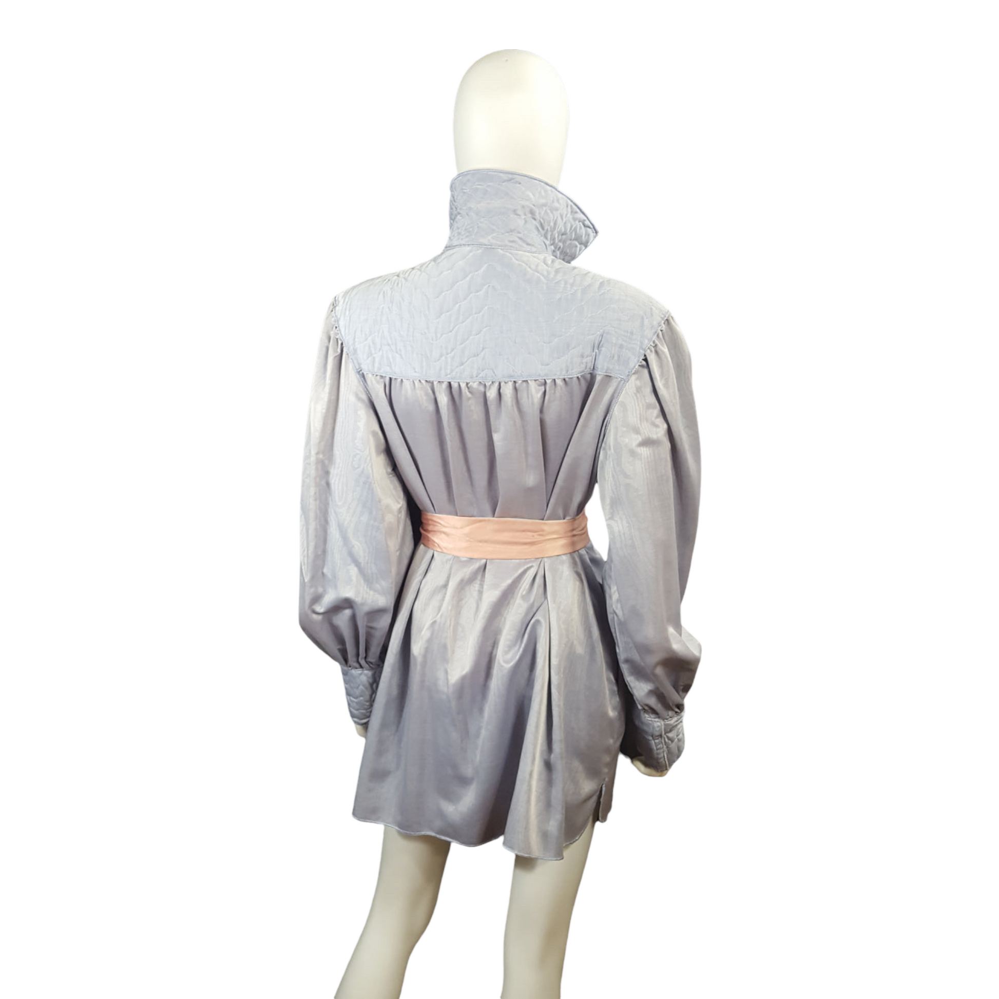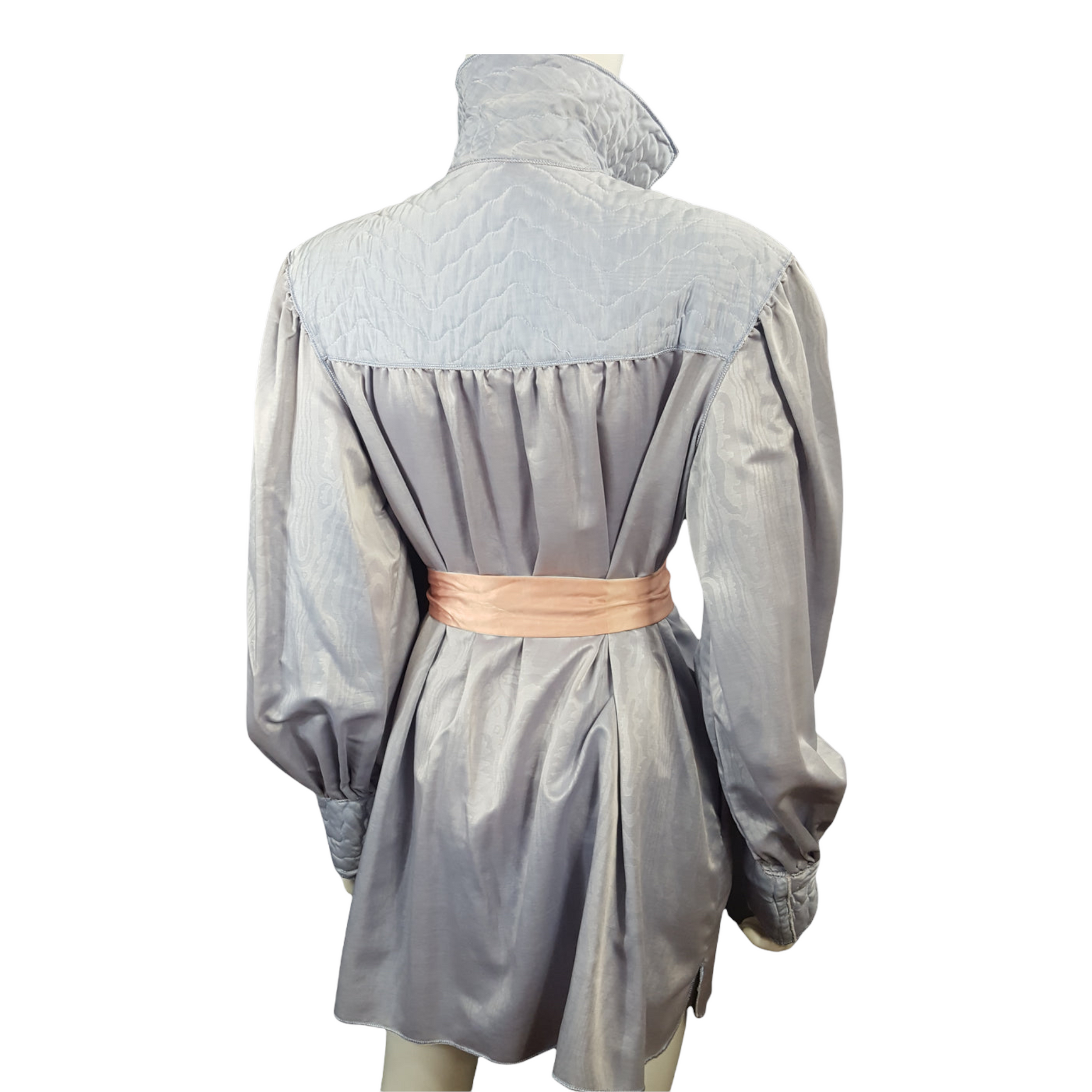 Gorgeous moire satin womens bishop sleeve, zip tunic, with quilted detailing, zip front and pockets. Prior owner said she just wore it around the house when she had guest. Its really stunning, in excellent condition!
