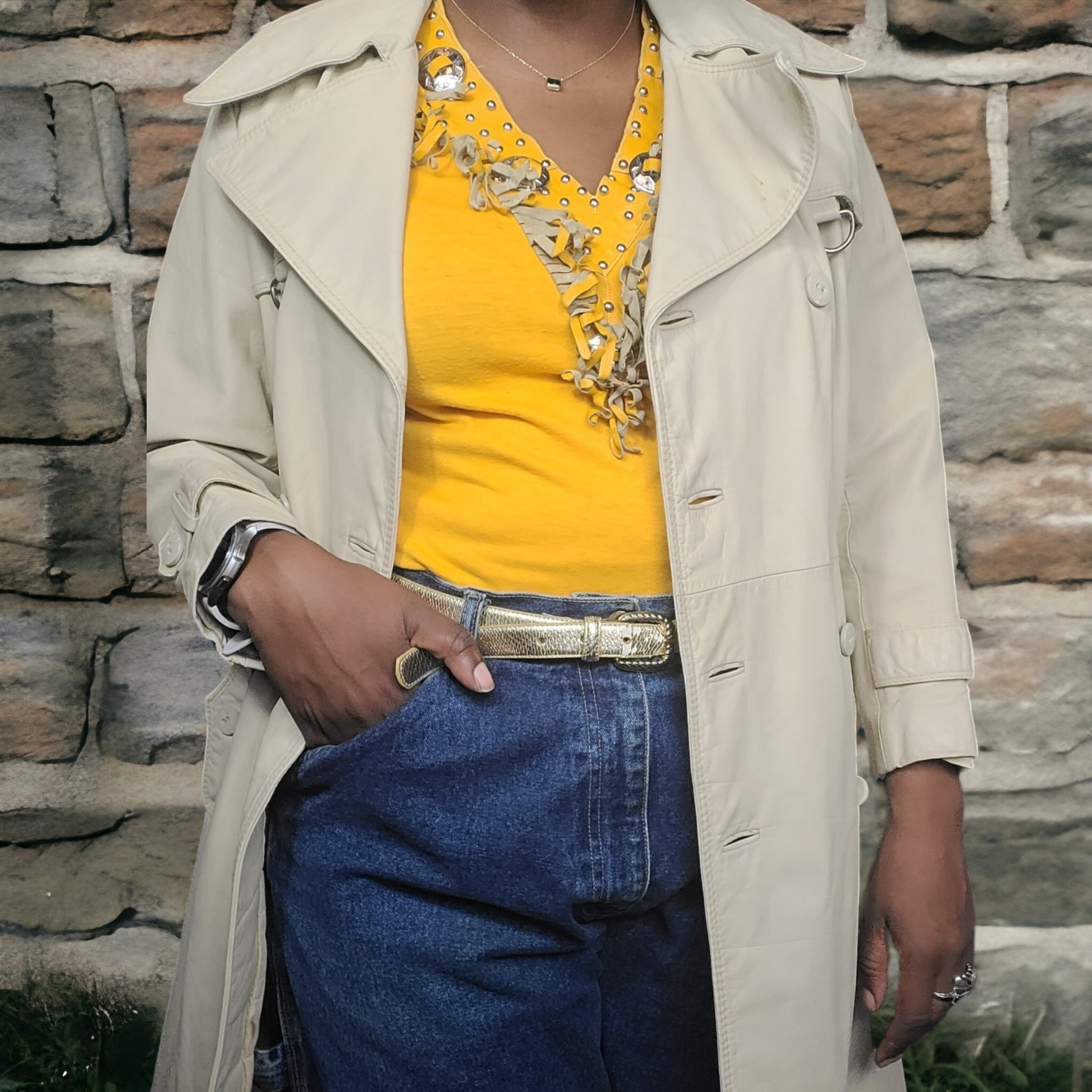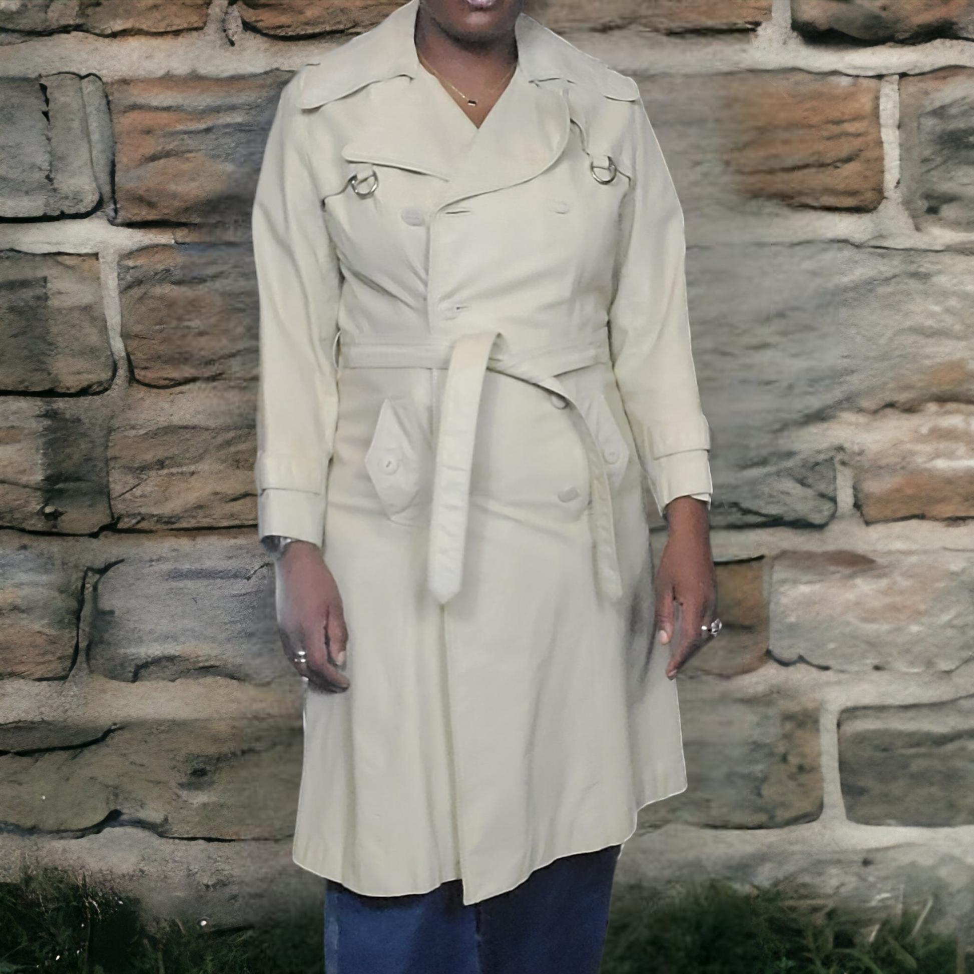 Palpable nostalgia meets sartorial grandeur with this classic 70s Vintage Leather Trench Coat in bone cream, a true collector's gem. Embark on a voyage to the elegant past with this resplendent masterpiece infused with opulence. Crafted with utmost precision, this meticulously tailored trench coat embodies the essence of luxury and refinement. The leather drapes elegantly, while the intricate craftsmanship ensures it remains a prized possession for generations to come. Elevate your style to regal heights with this vintage treasure that effortlessly captures the essence of the glorious 70s, and will seamlessly become an asset to your wardrobe.