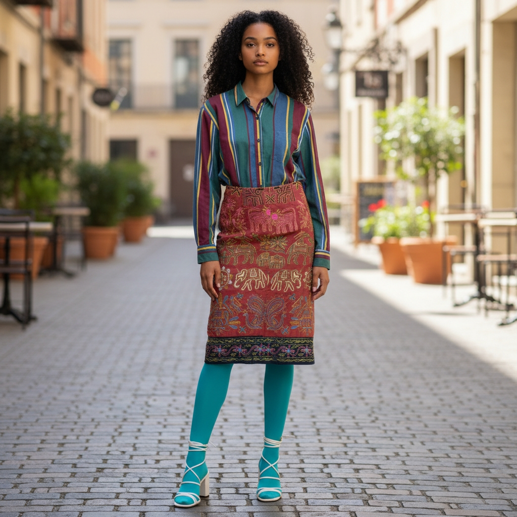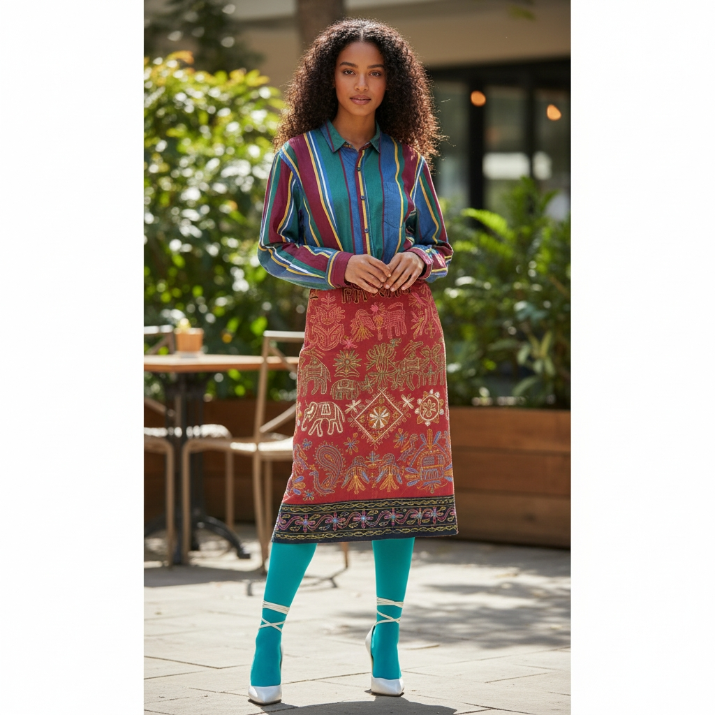 Introducing a true statement piece from the 1980s Dona Jean collection - the Tribal Embroidered Midi Skirt. Crafted with intricate gold embroidery and featuring a striking tribal pattern, this skirt exudes elegance and sophistication. With side splits for added flair, this piece is a must-have for any fashion-forward woman.