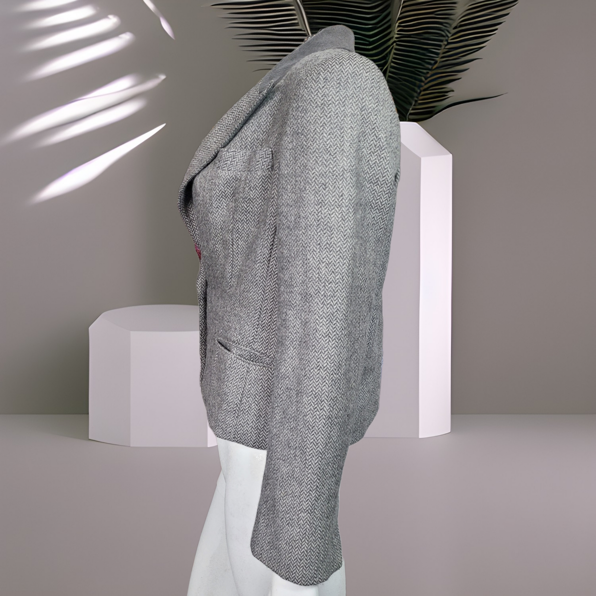 Add a touch of class and sophistication to your wardrobe with this classic, supremely tailored Molisani, grey wool herringbone blazer, from the early 90s. Effortlessly chic paired with virtually anything in a modern wardrobe!