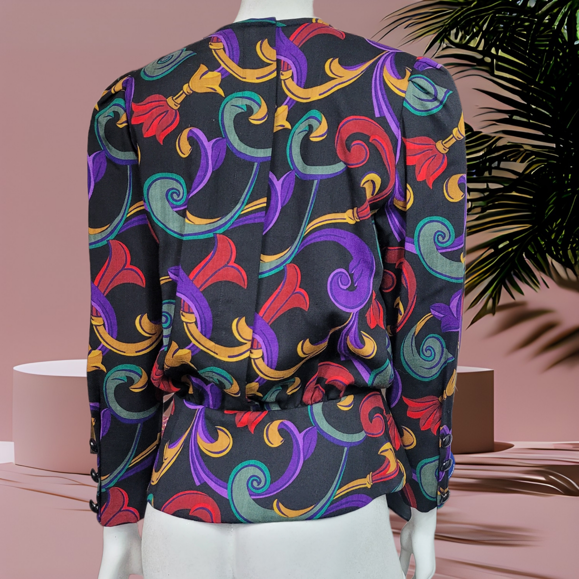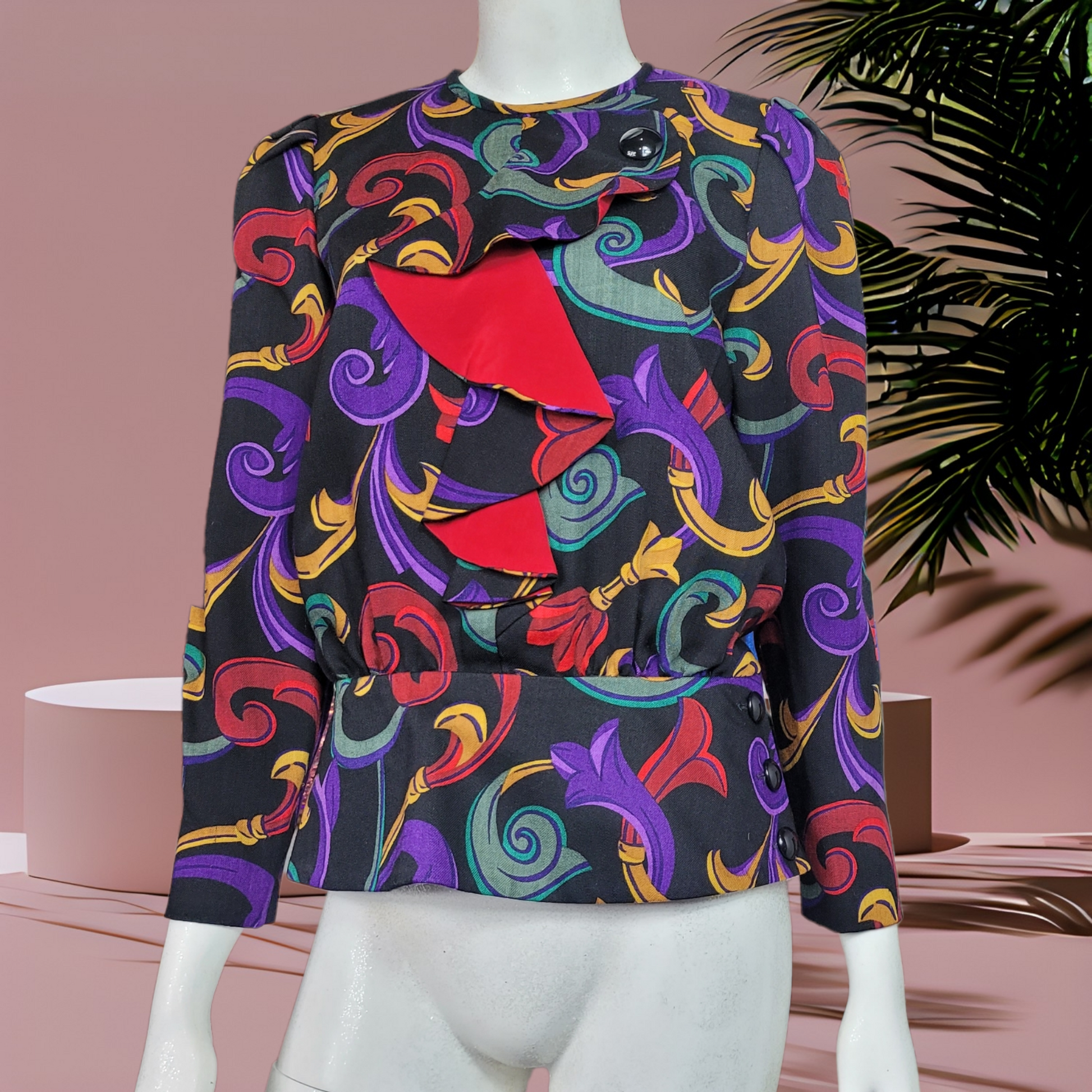 Gorgeous 80s wool peplum top, with beautiful print. Shirt features, contrasting red silky cascade, down center front, back buttons, and buttons at the waist, and wrist.