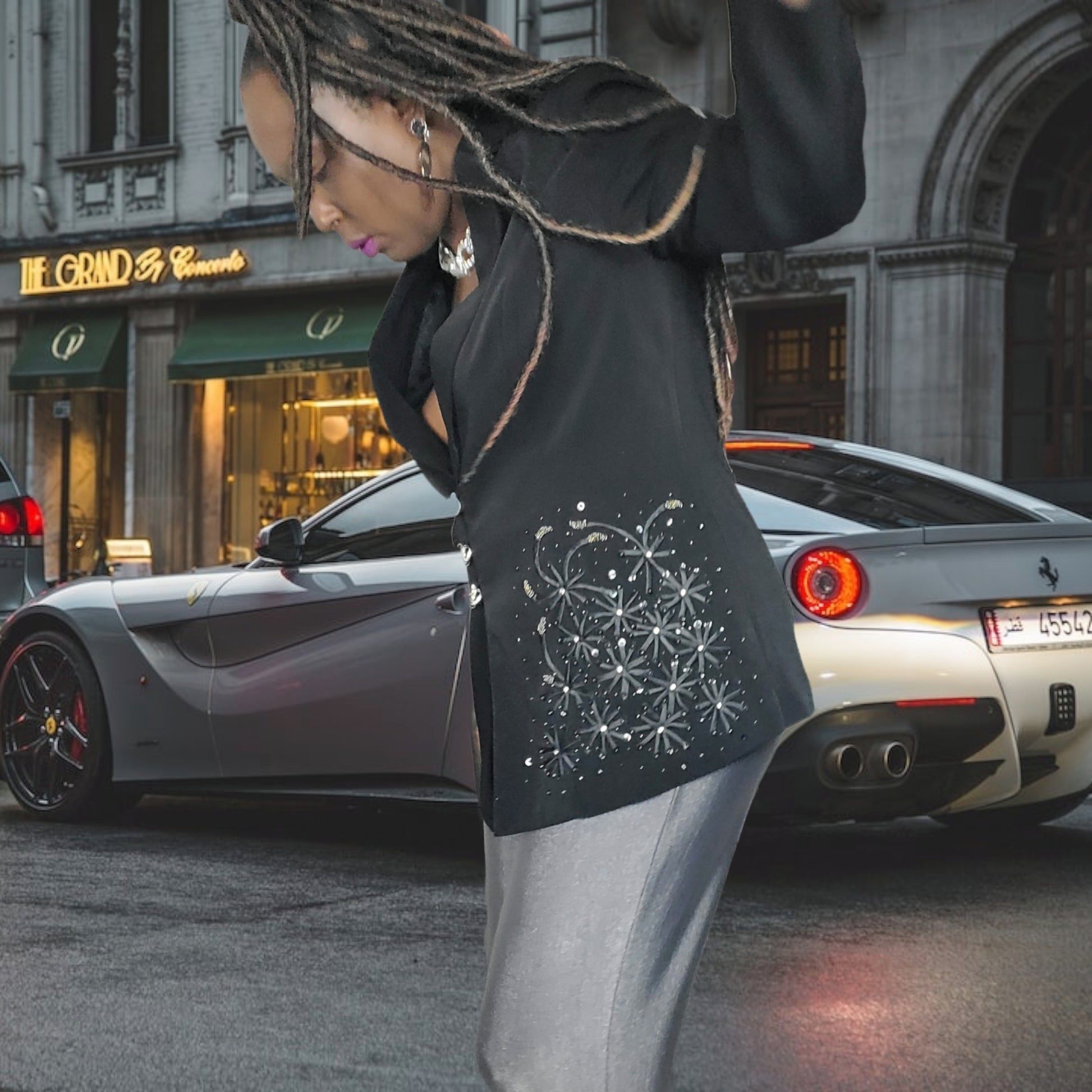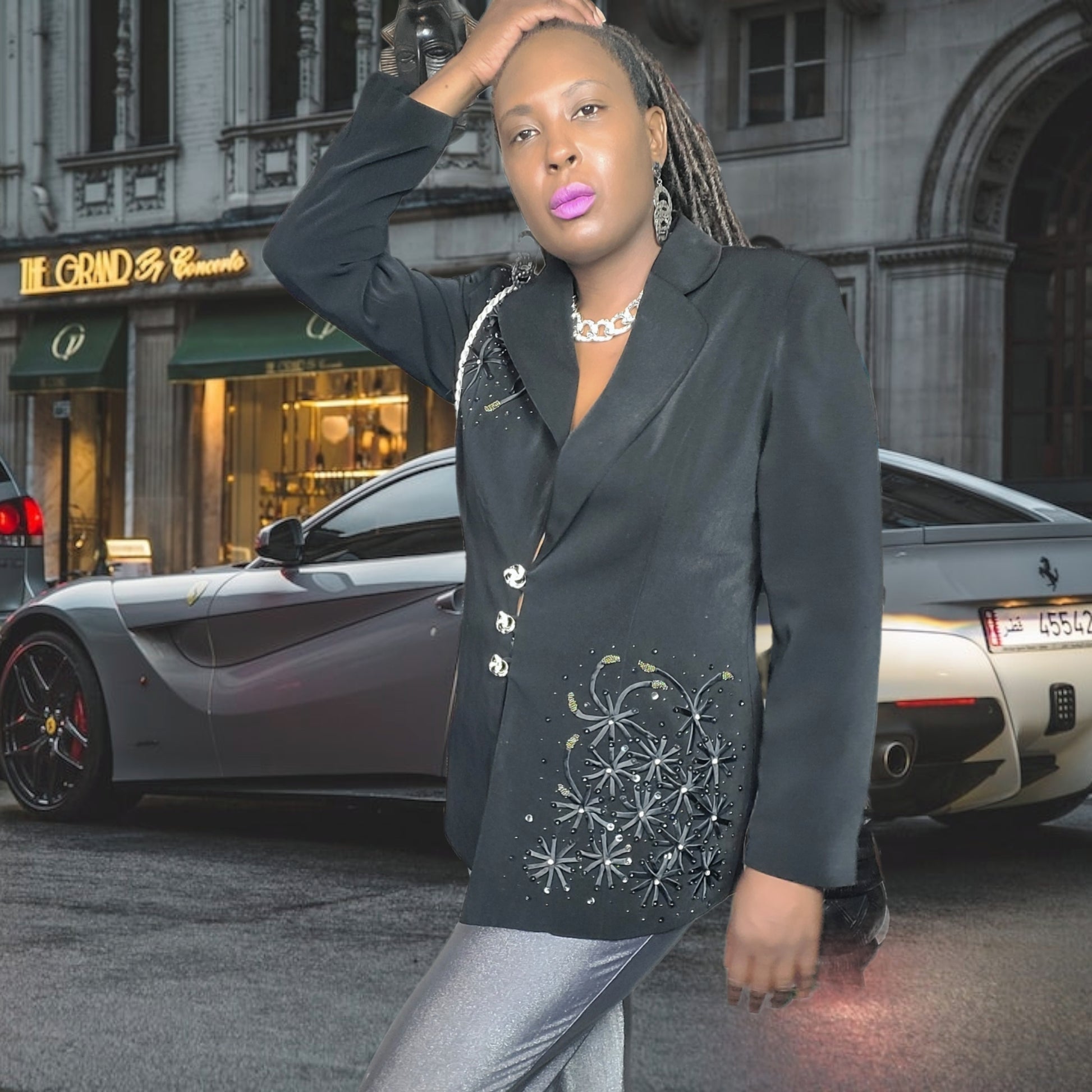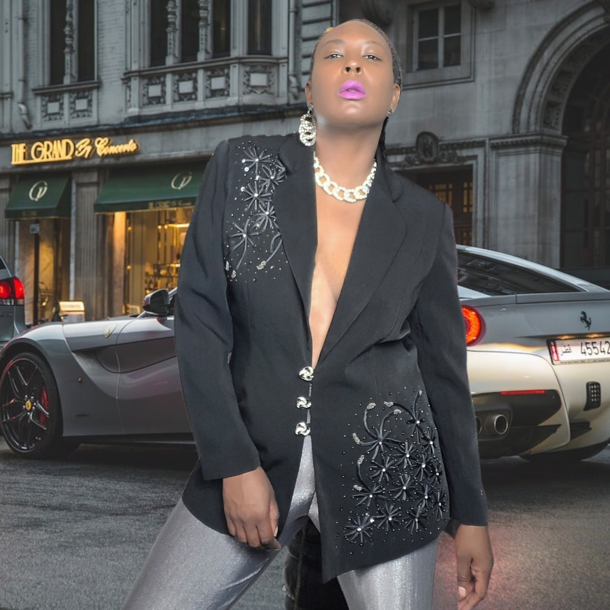 Stunning black 90s Vintage blazer! Beautifully adorned beads and floral ribbon detail, and even more beautiful buttons, and logo signed lining. In excellent vintage condition!