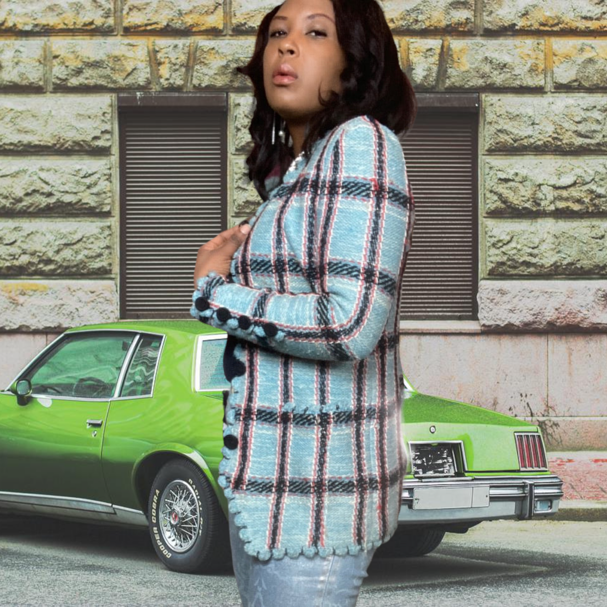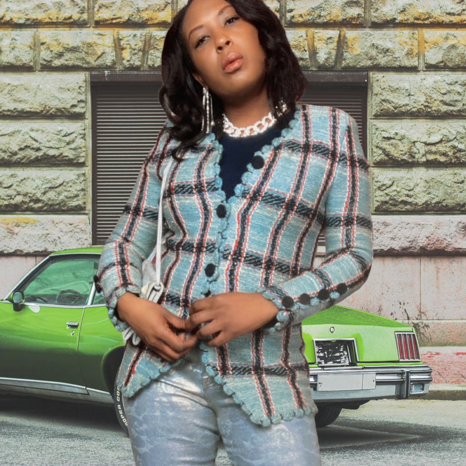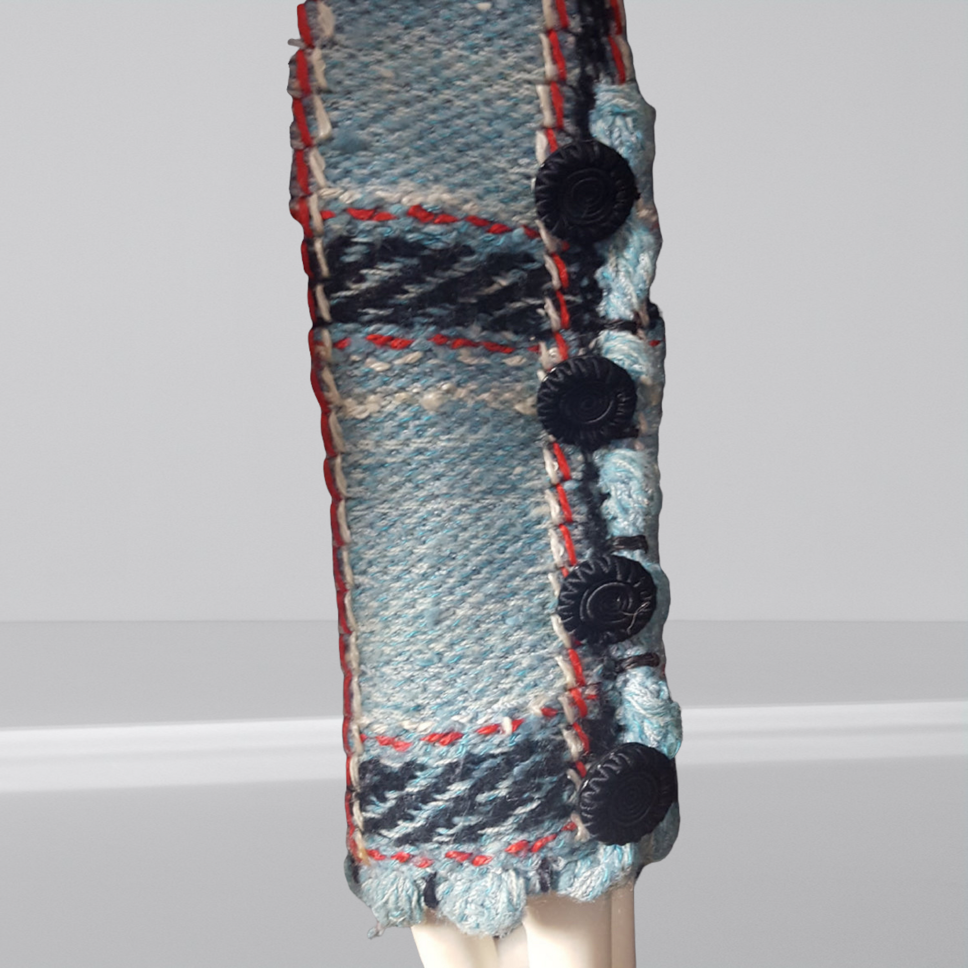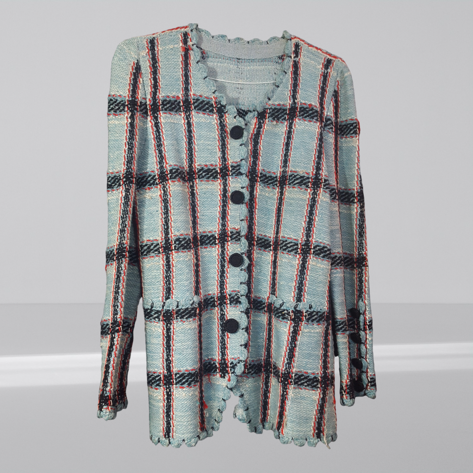 Divine, unsigned Adolfo hand woven wool plaid blazer. Has scalloped hem and equally divine fabric covered buttons. Front pockets.