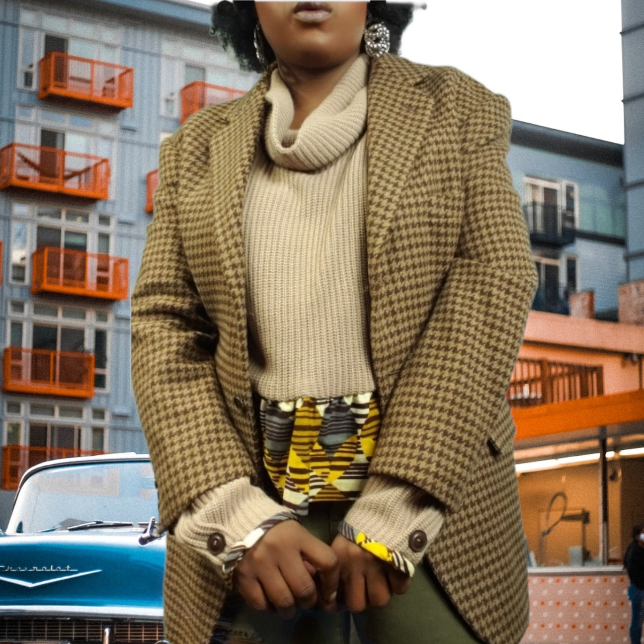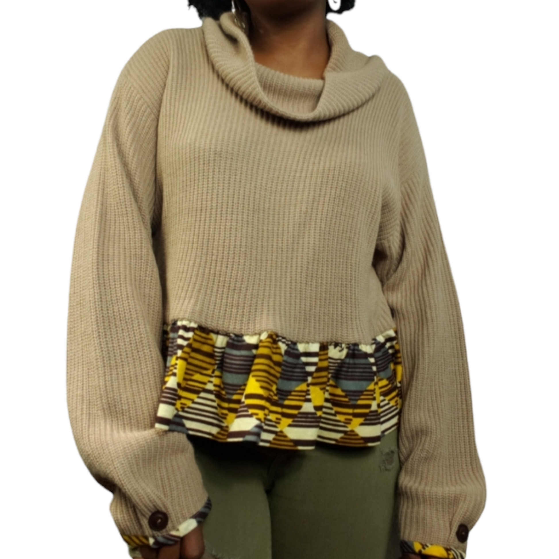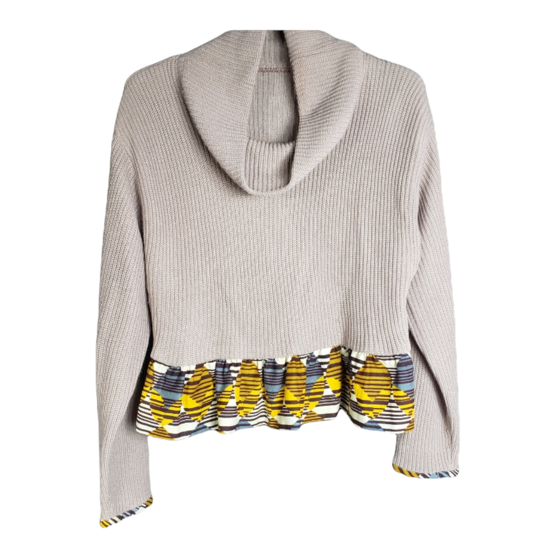 Flirty, flowy sleeve, rib knit sweater, with African print trim.