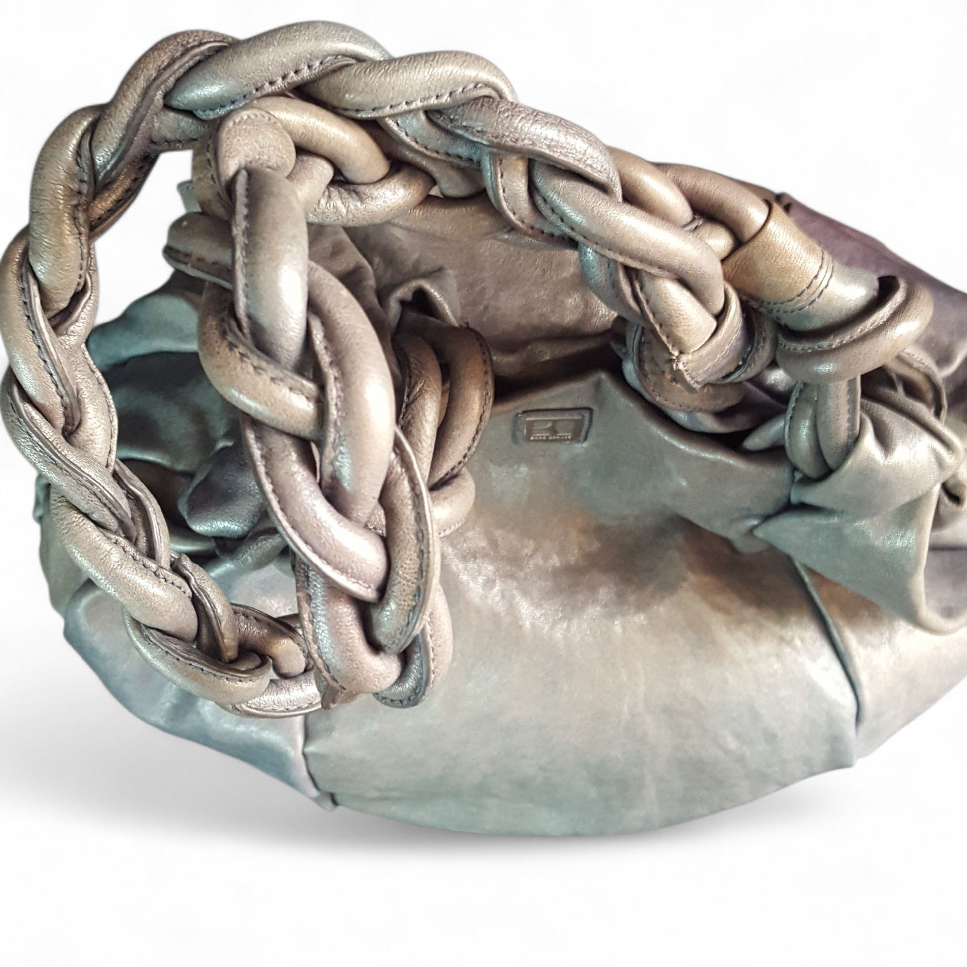 Large pearlescent, braided handle sloucy leather hobo. In excellent preloved condition.