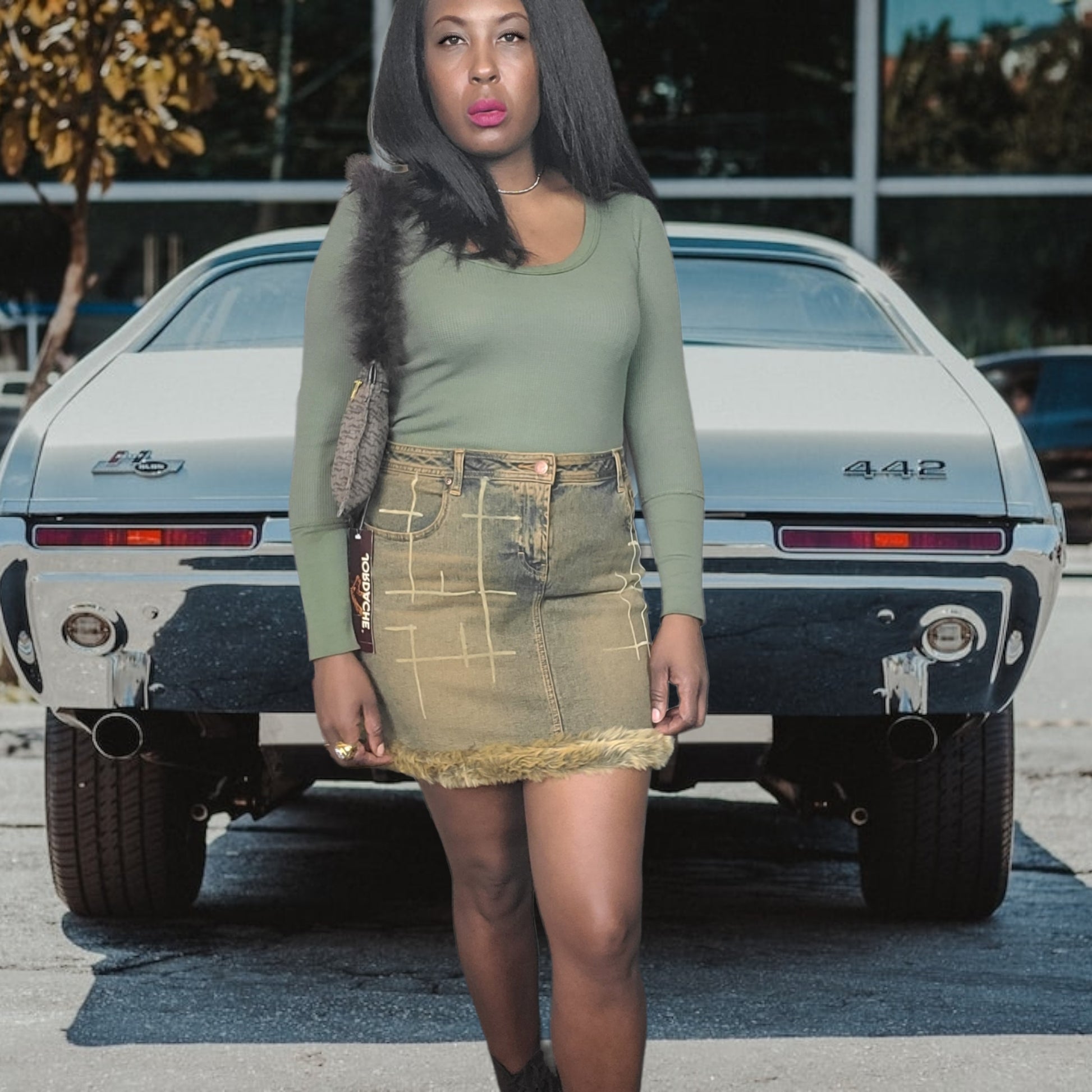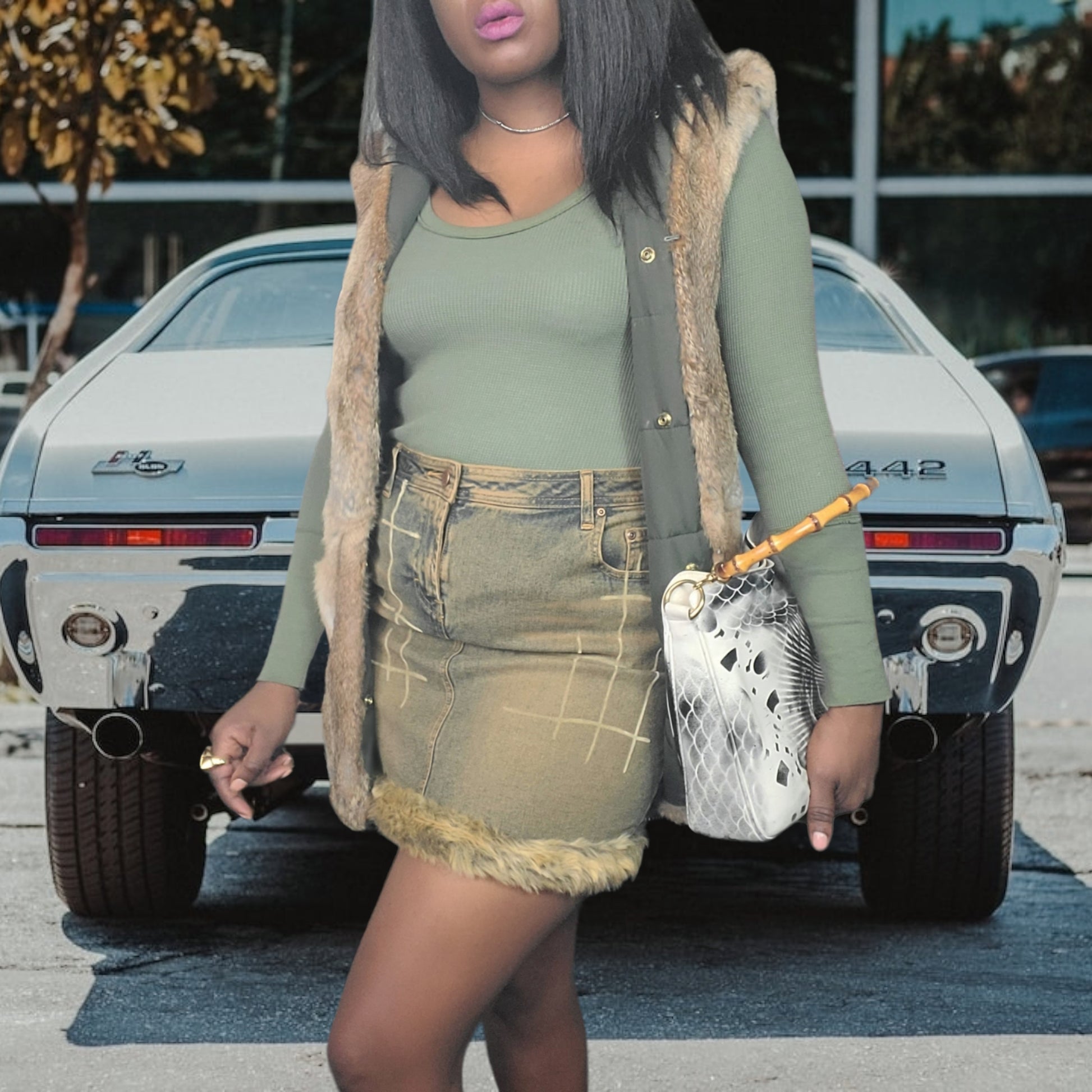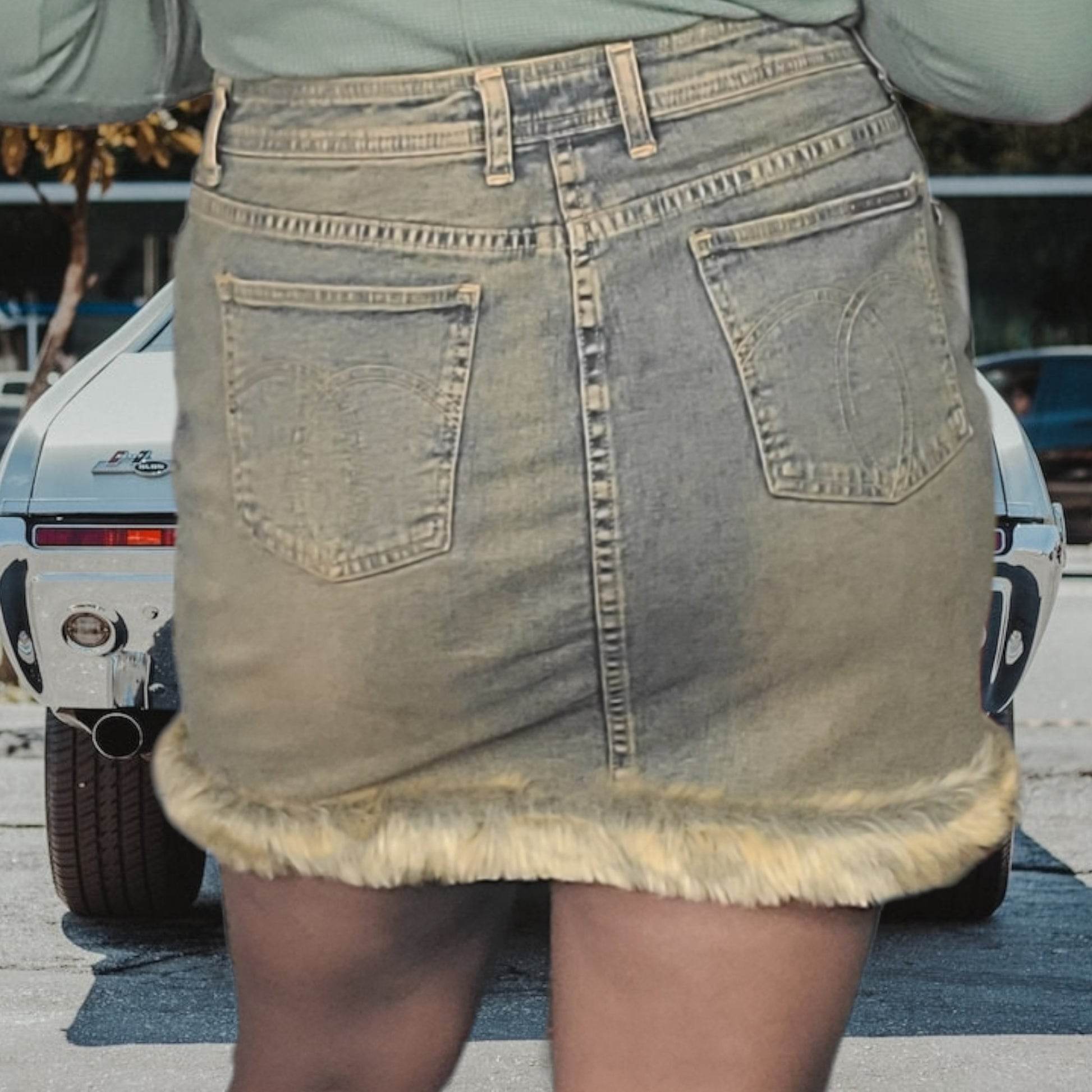 This ultra cute and rare 80s Jordache denim skirt, stonewashed with a green tint, and painted cross hatch print, and faux fur trim.