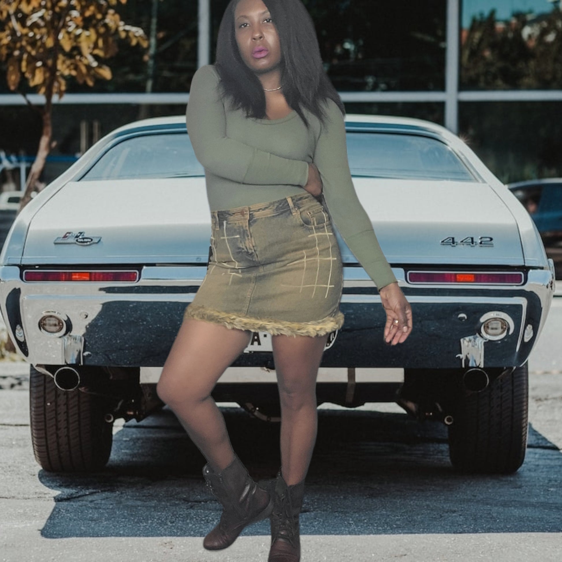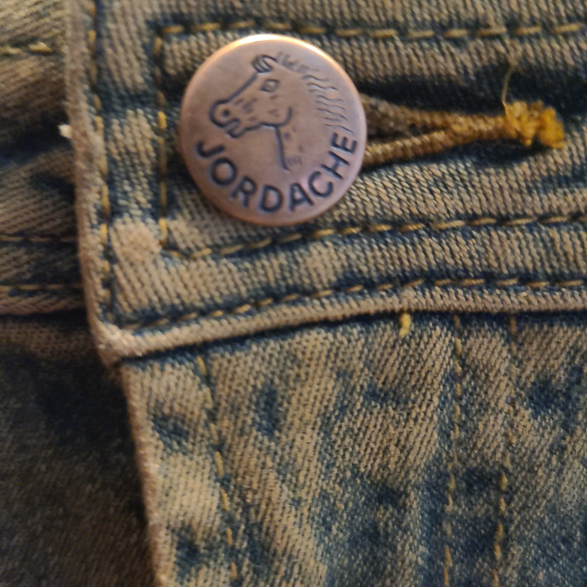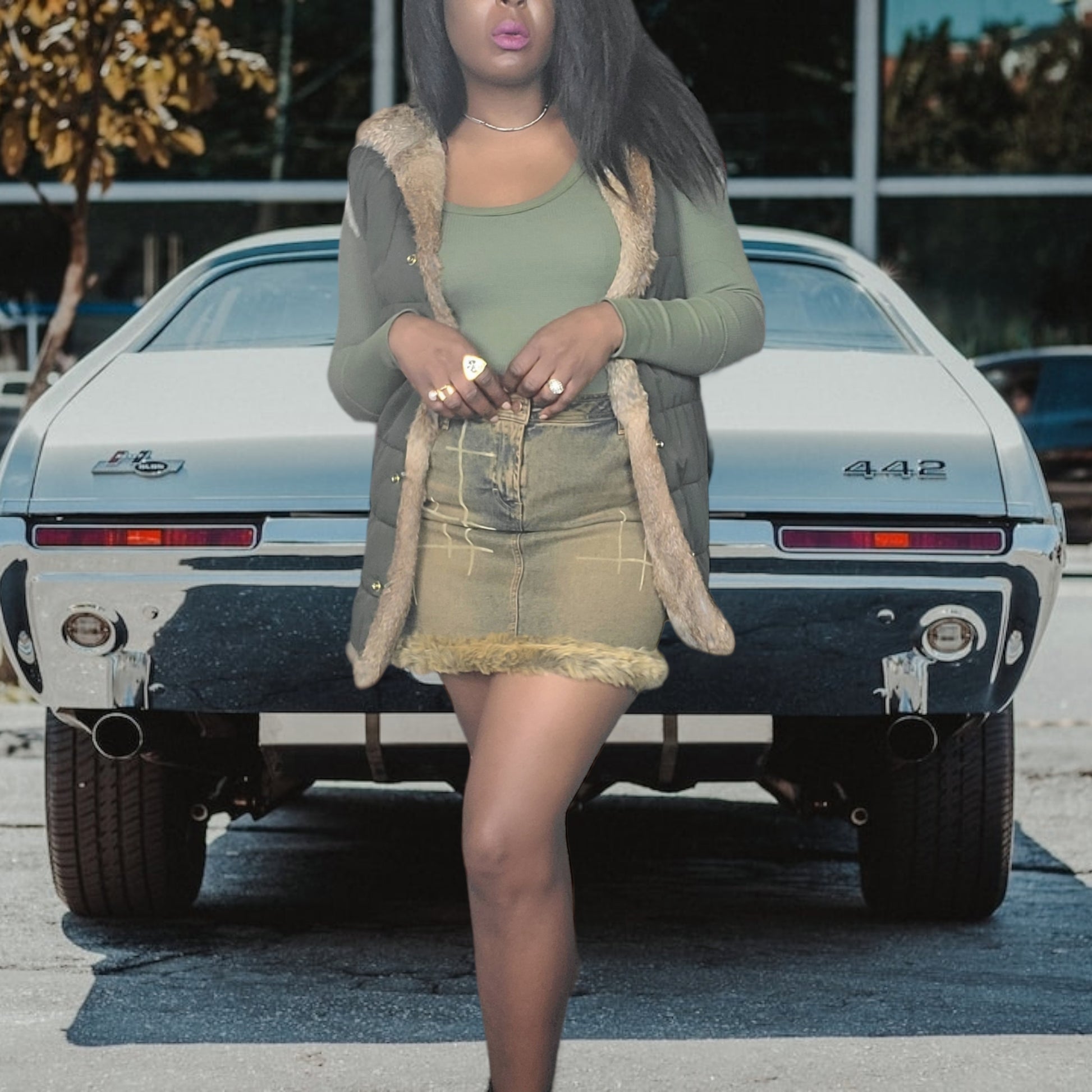 This ultra cute and rare 80s Jordache denim skirt, stonewashed with a green tint, and painted cross hatch print, and faux fur trim.