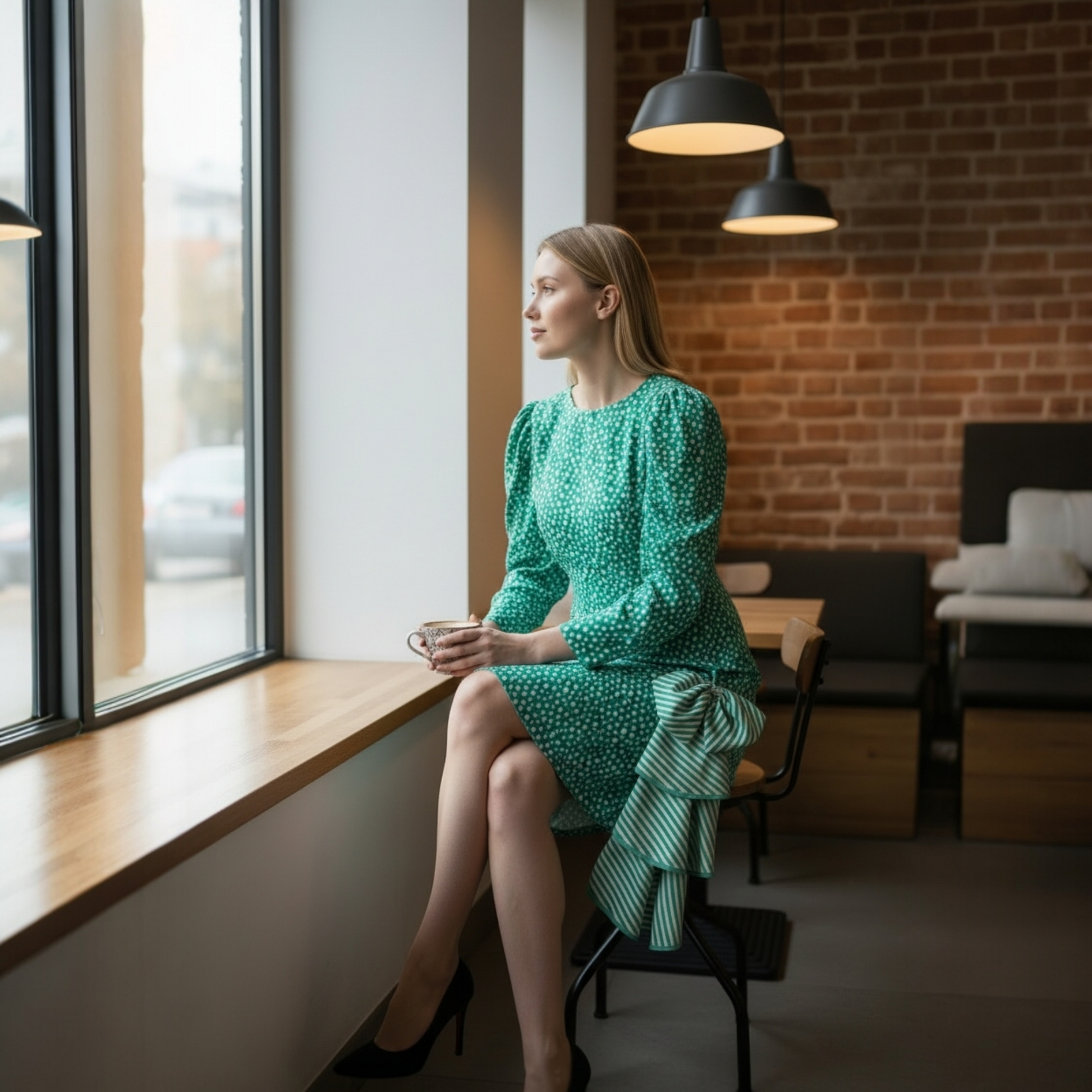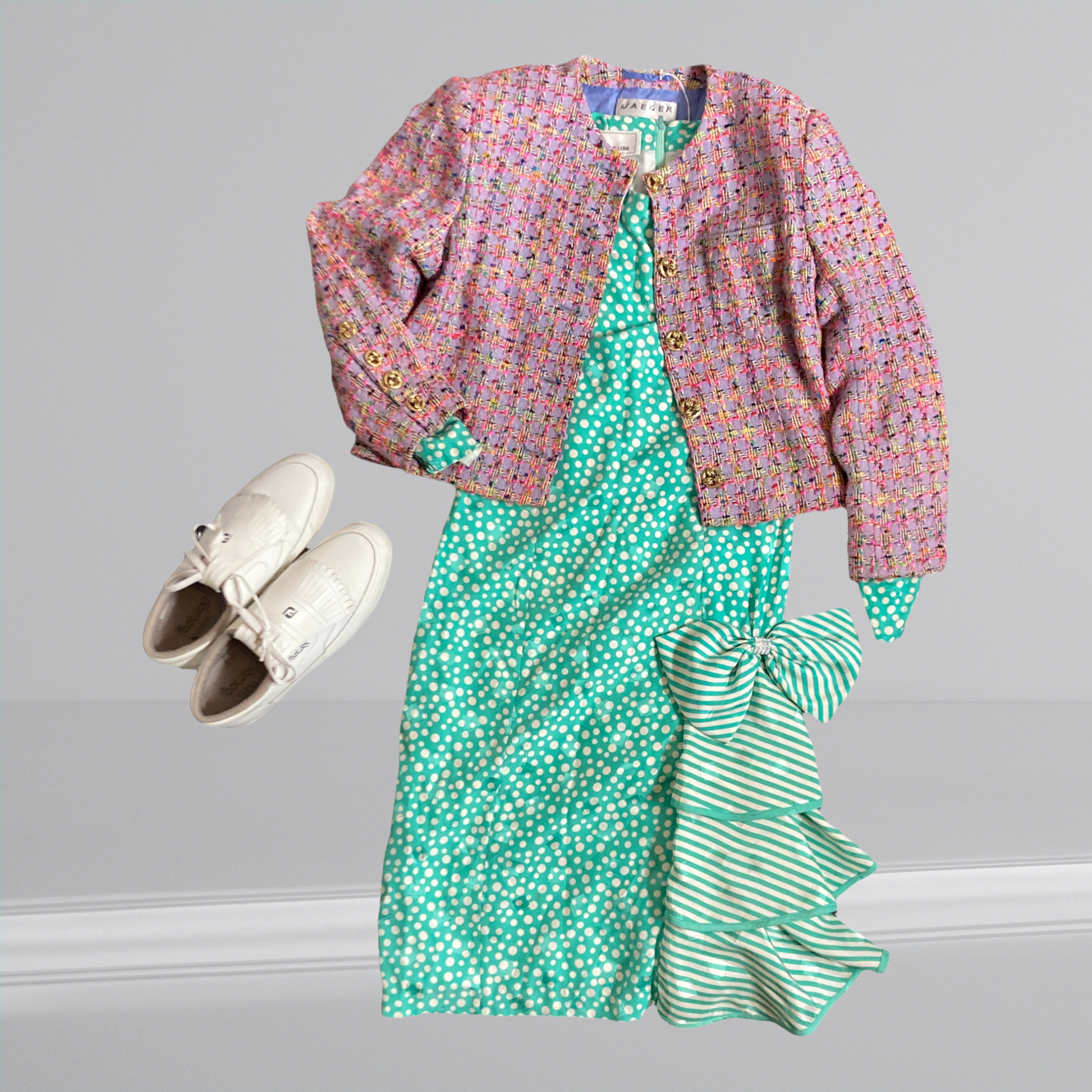 Ladies, feast your eyes on this beautiful 80s silk jacquard midi dress! With its striking turquoise and white colors, dazzling polka dot print, and cascading bow detail, this dress is sure to turn heads. Whether you're dressing up for a party or just want to feel confident and fabulous everyday, the Junnie Leigh is perfect for you. So score this babetoday and let the good times roll!