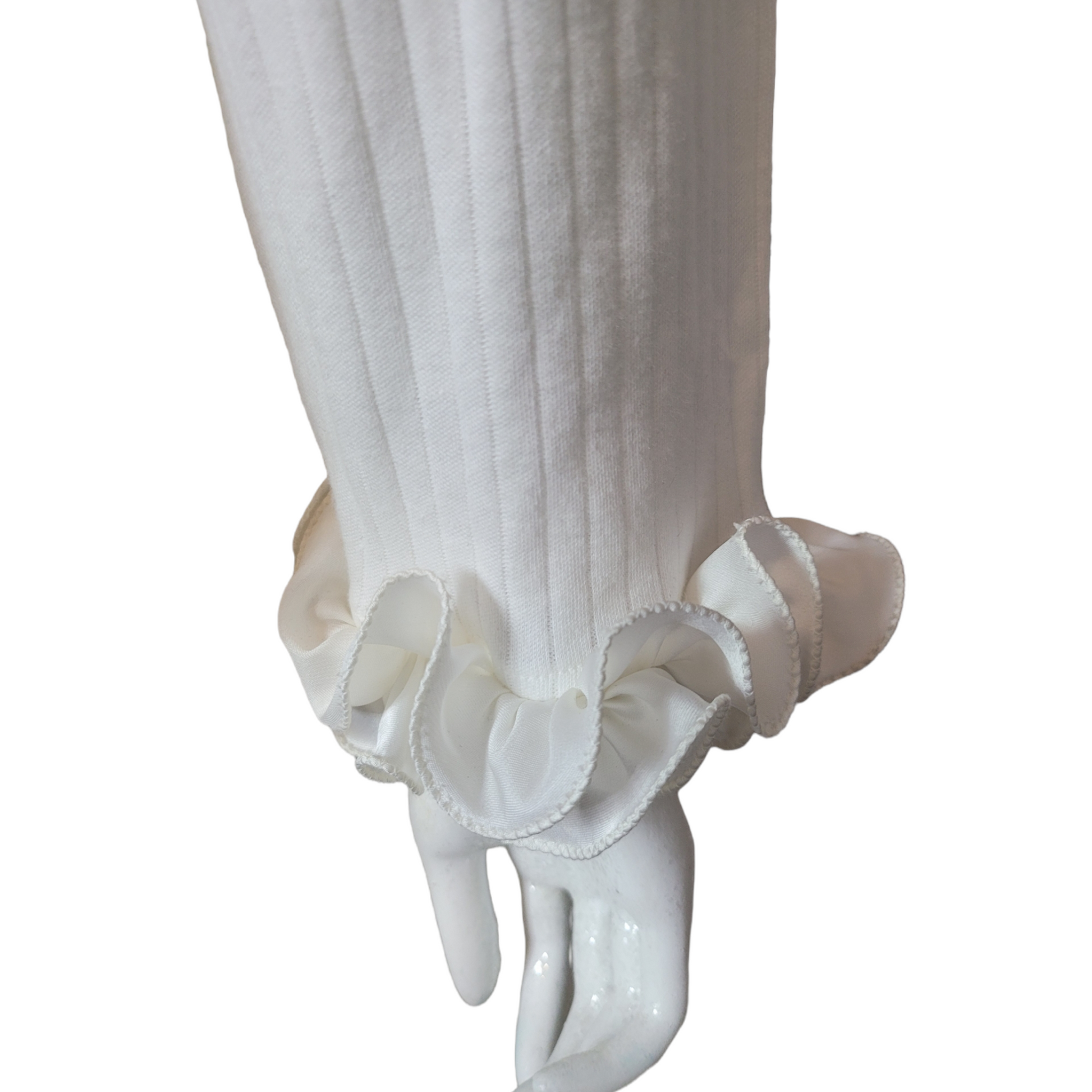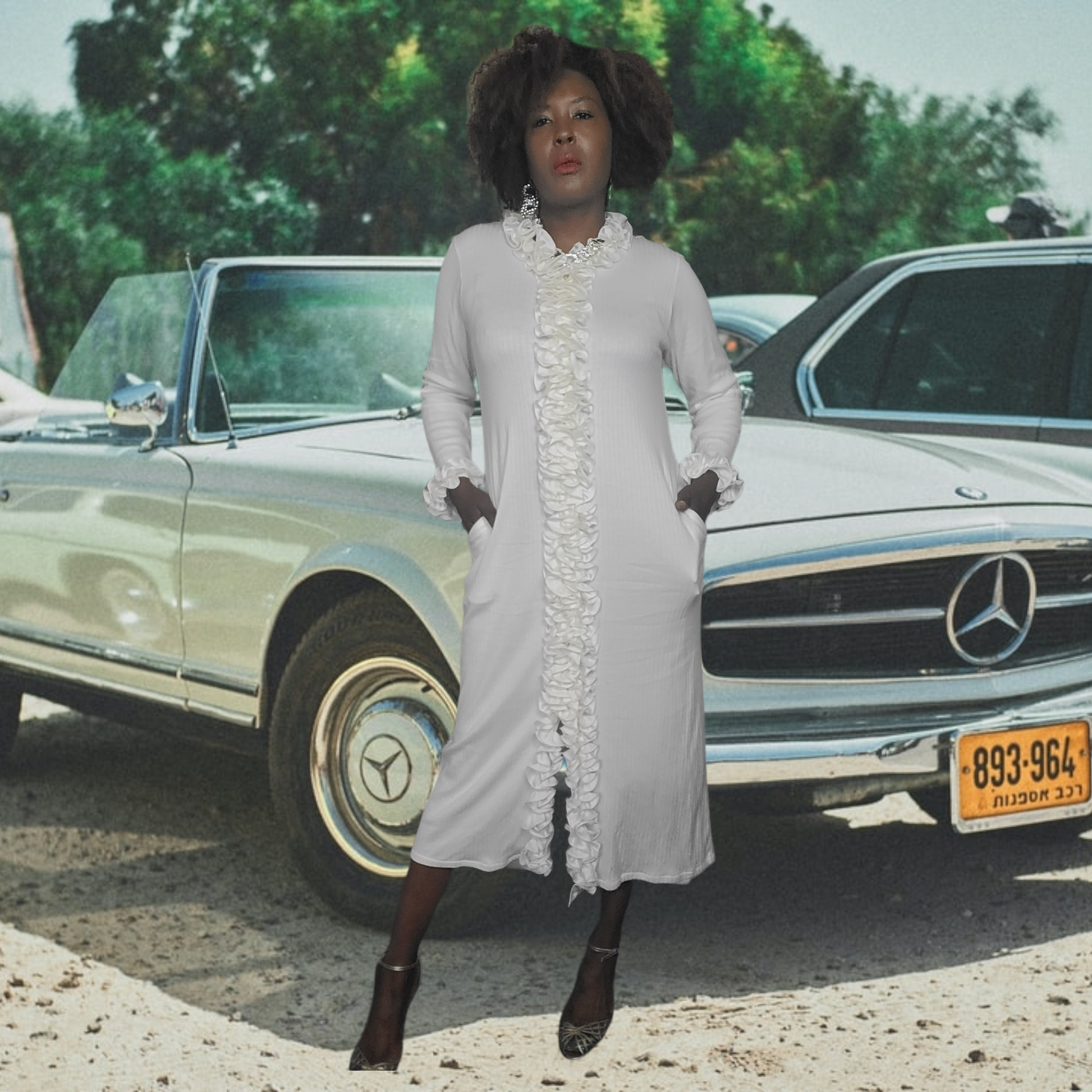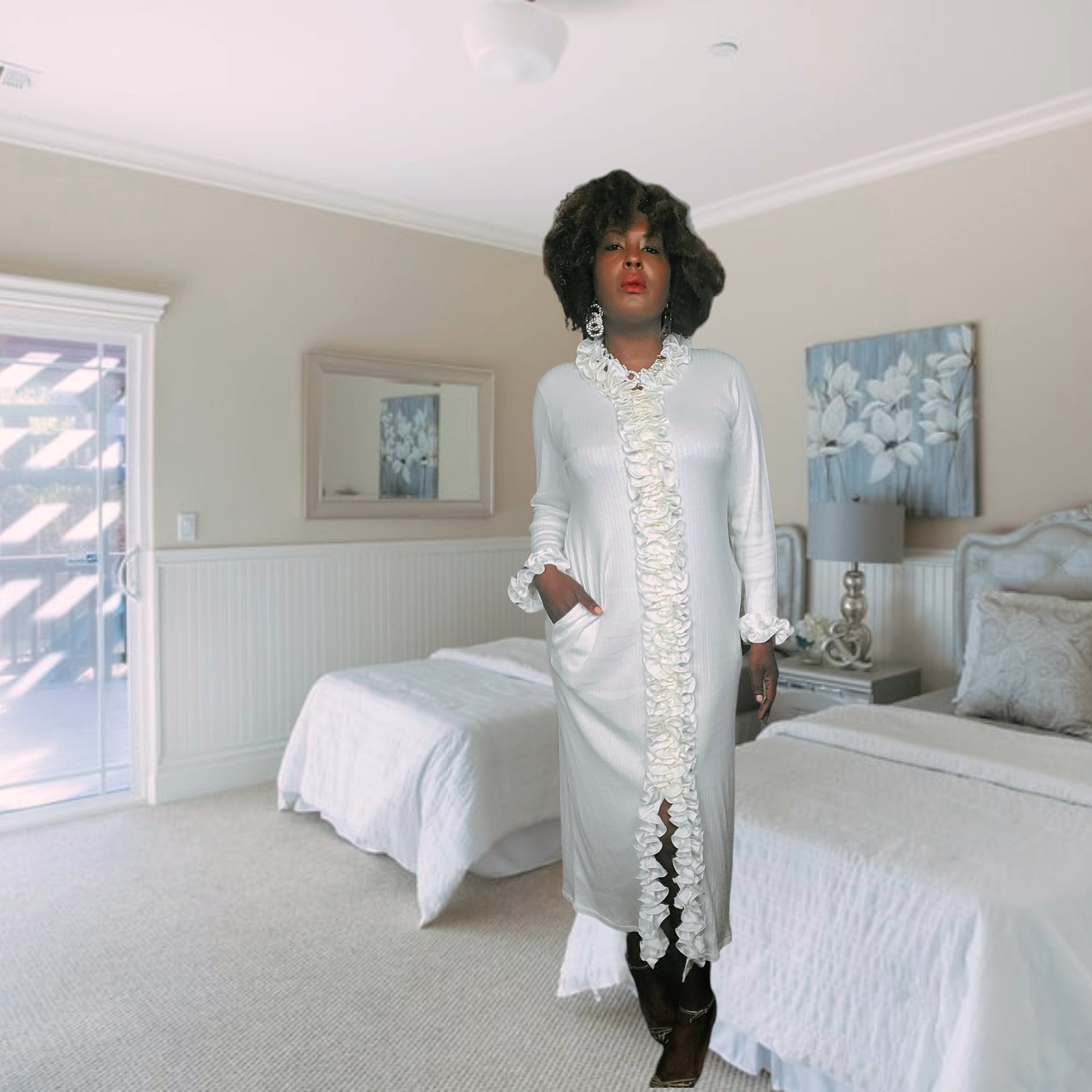 Have all the frills in this glorious white ribbed, maxi zip up robe with ruffle trimming and pockets. The brand is known for there high end lingere. This piece can be worn in or out, perfect for resort destinations, or lounging around the house!