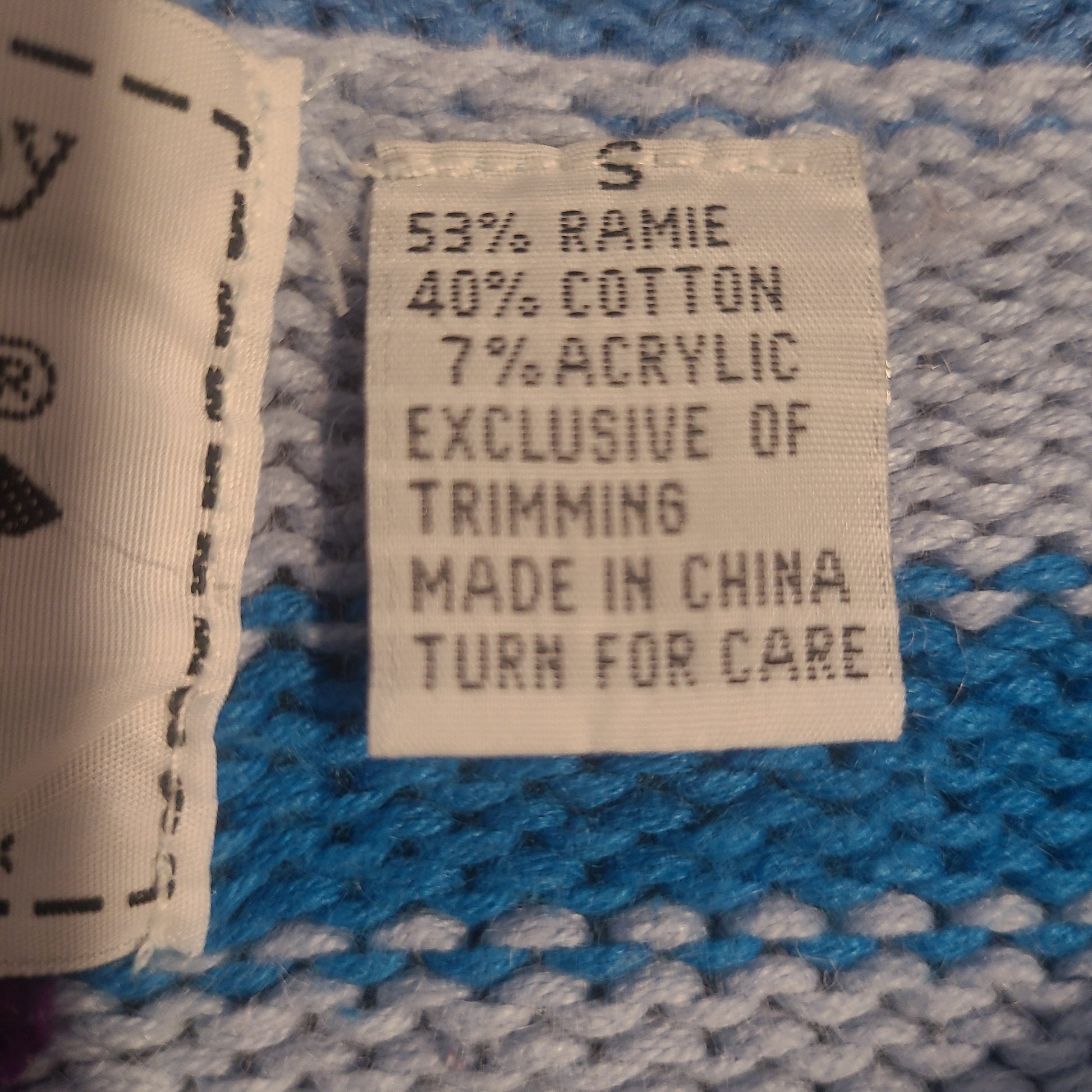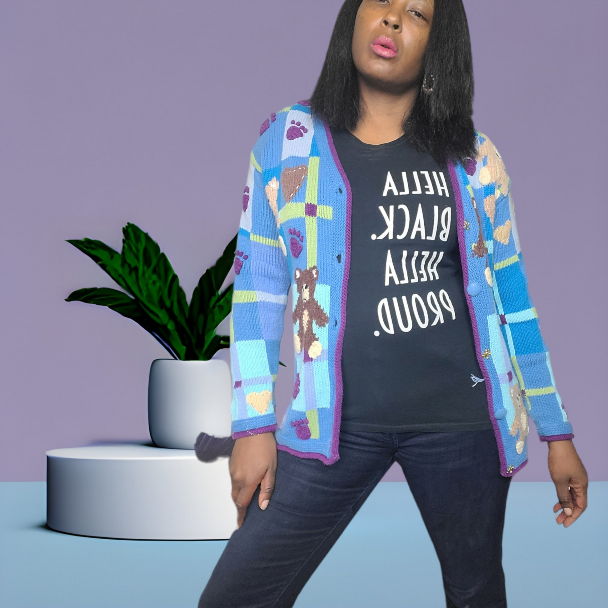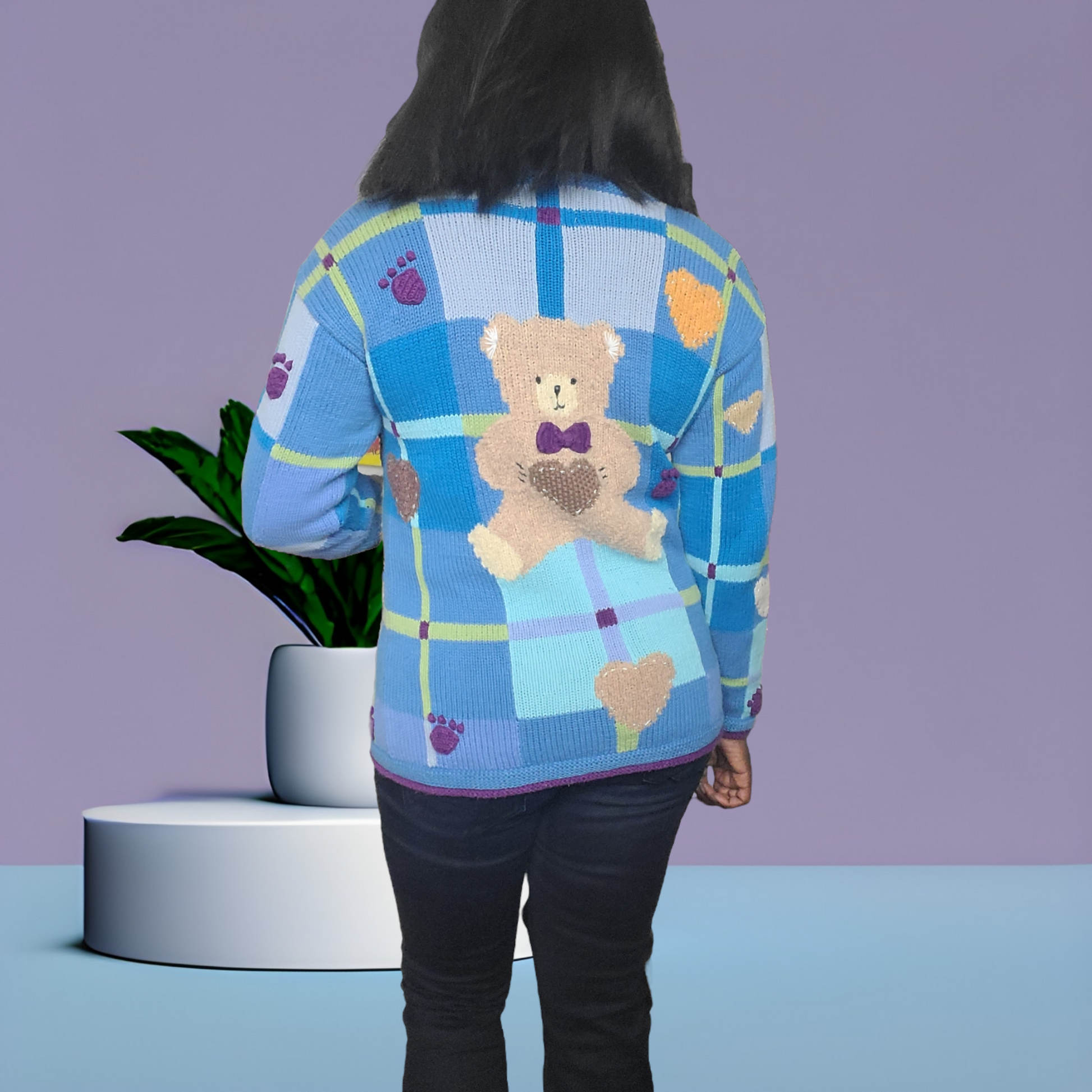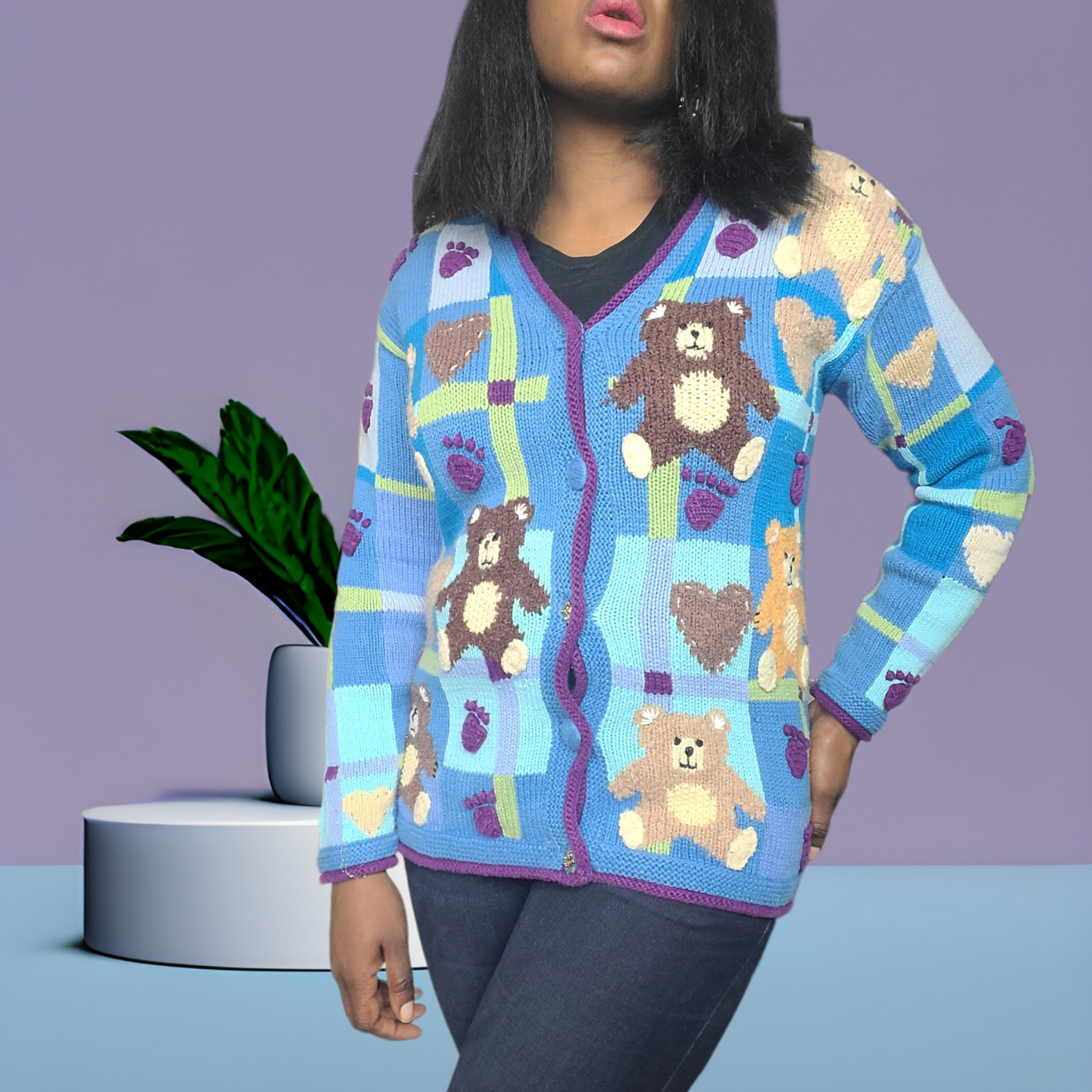 Adorable 1990s blue Storybook Knits teddy bear cardigan. Features two alternate gold bear buttons, v neck and purple trim. In excellent vintage condition.
