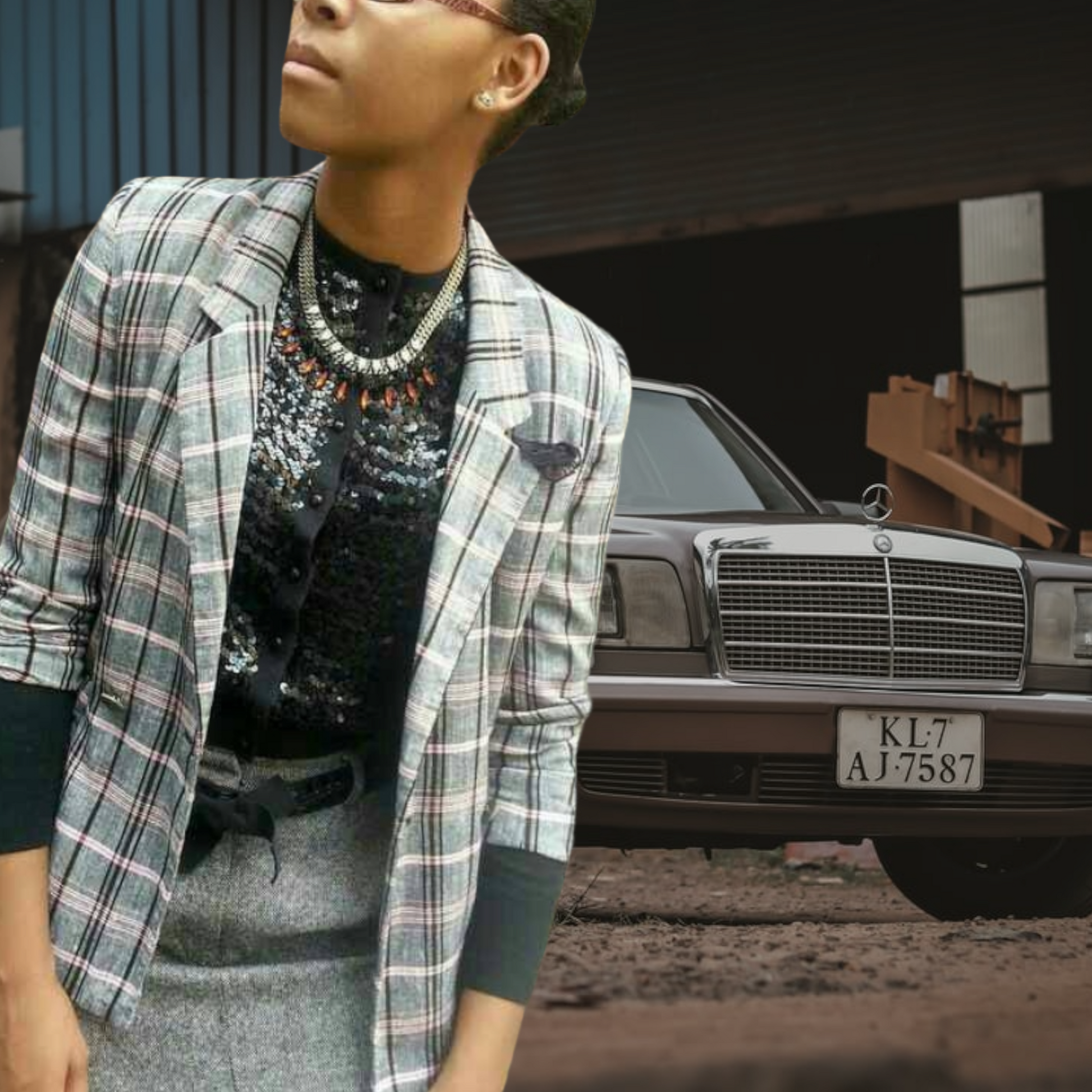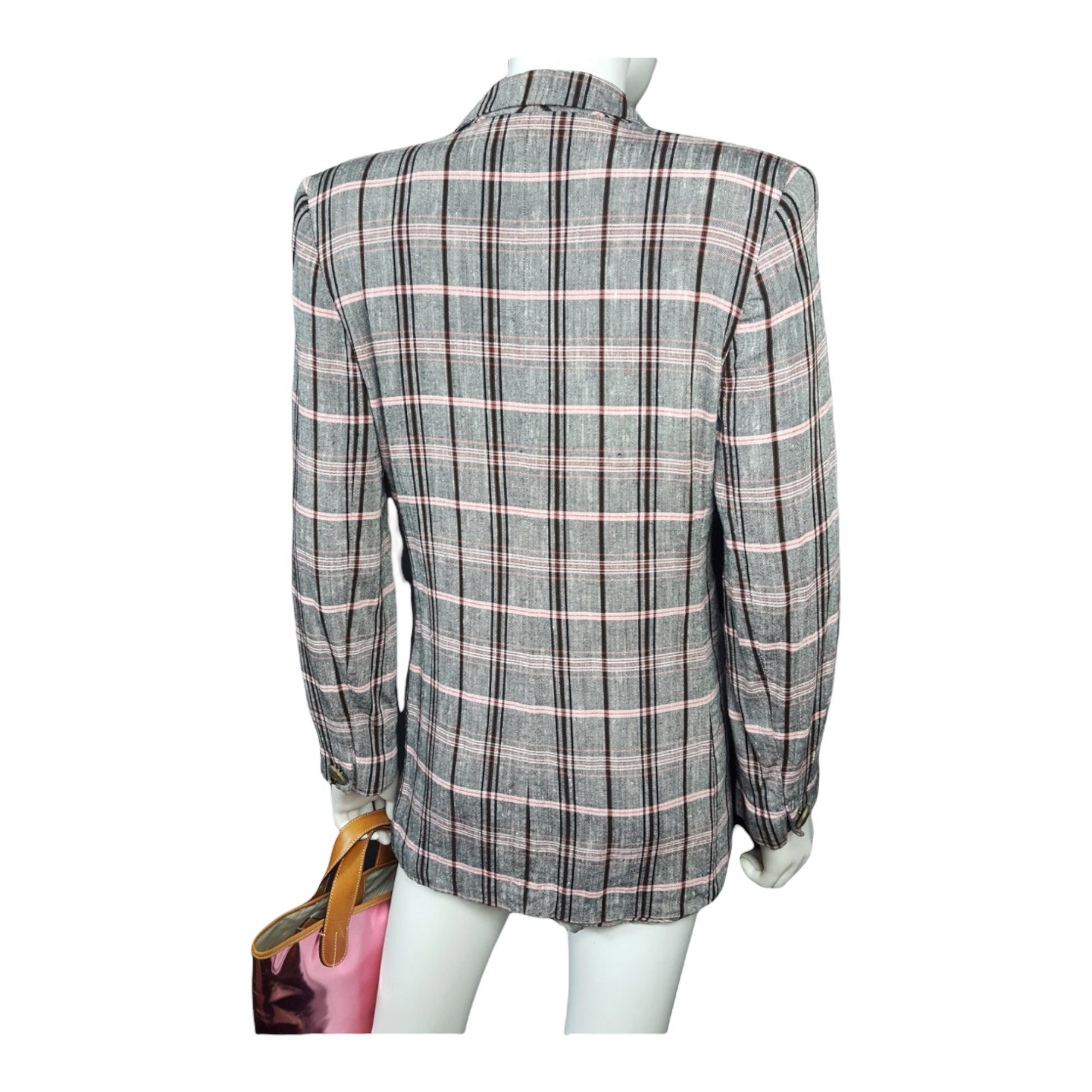 Circa 1970s Double breasted plaid linen and rayon blend with lace pocket square. Beautiful, in great vintage condition.