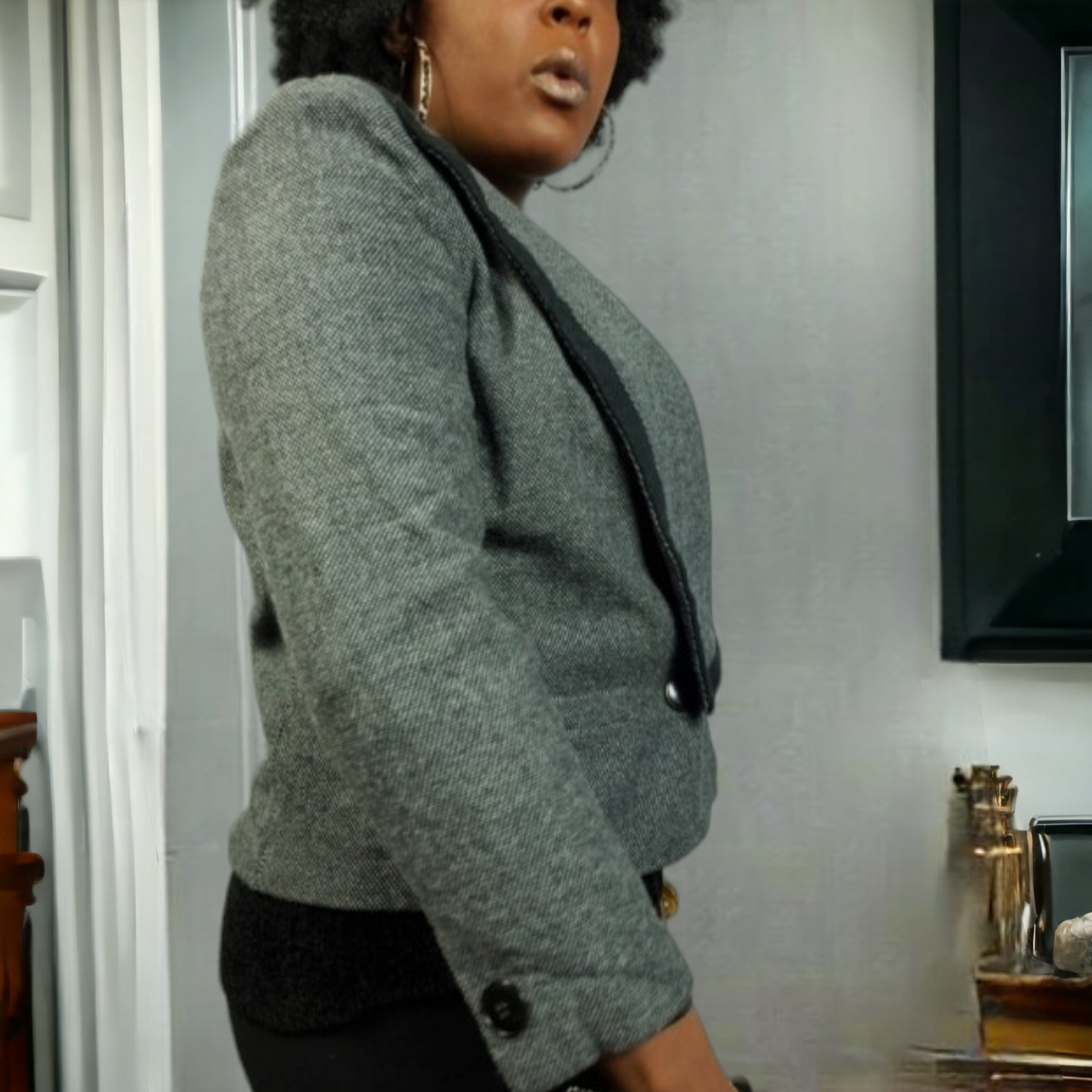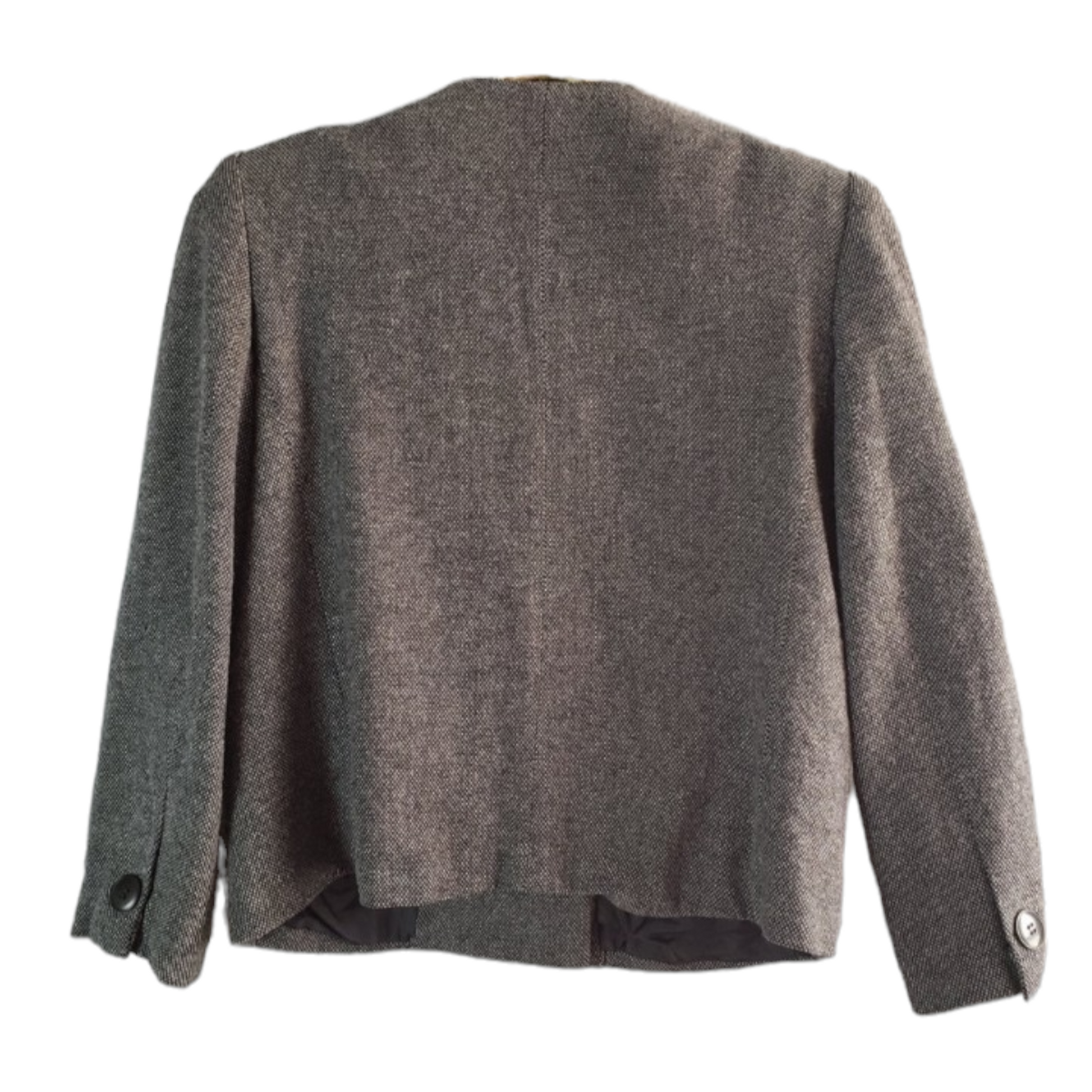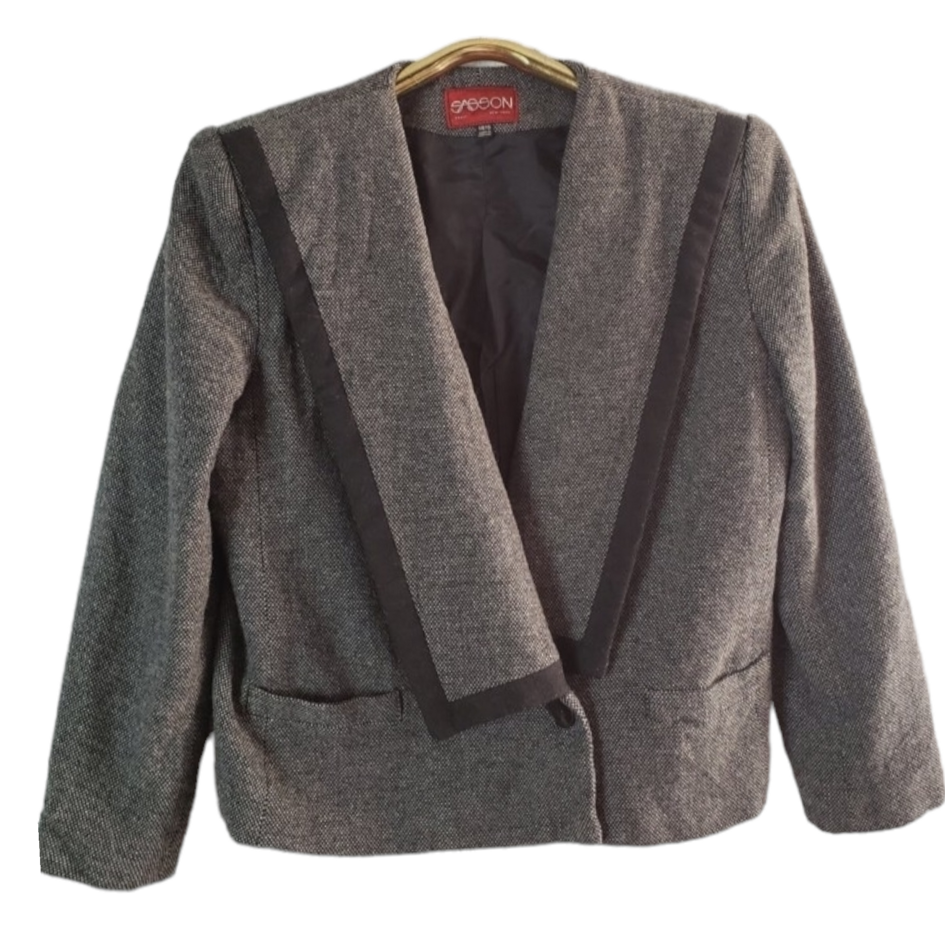 Black and gray wool blend crop jacket, with exaggerated lapel. In excellent vintage condition.