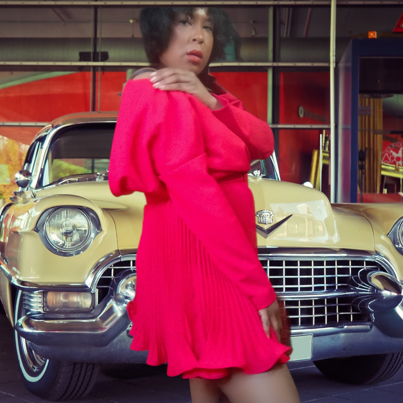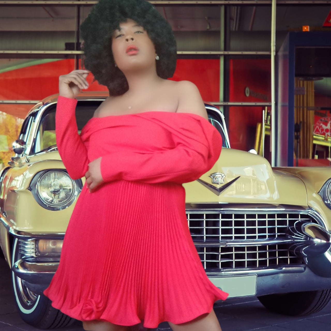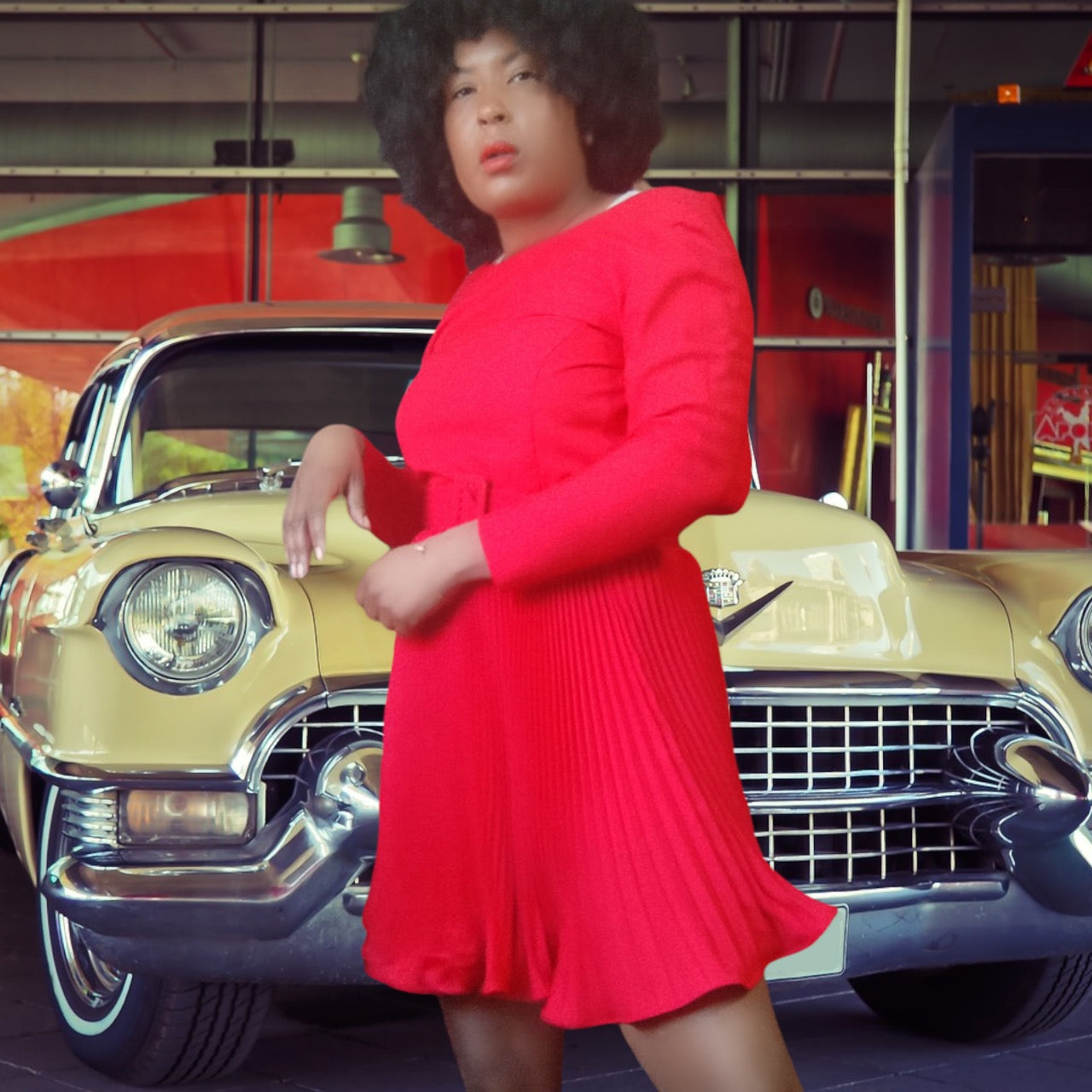 Gorgeous red belted fit and flare pleated skirt, with lettuce hem, dress. Snap off shoulder pads, back zipper.