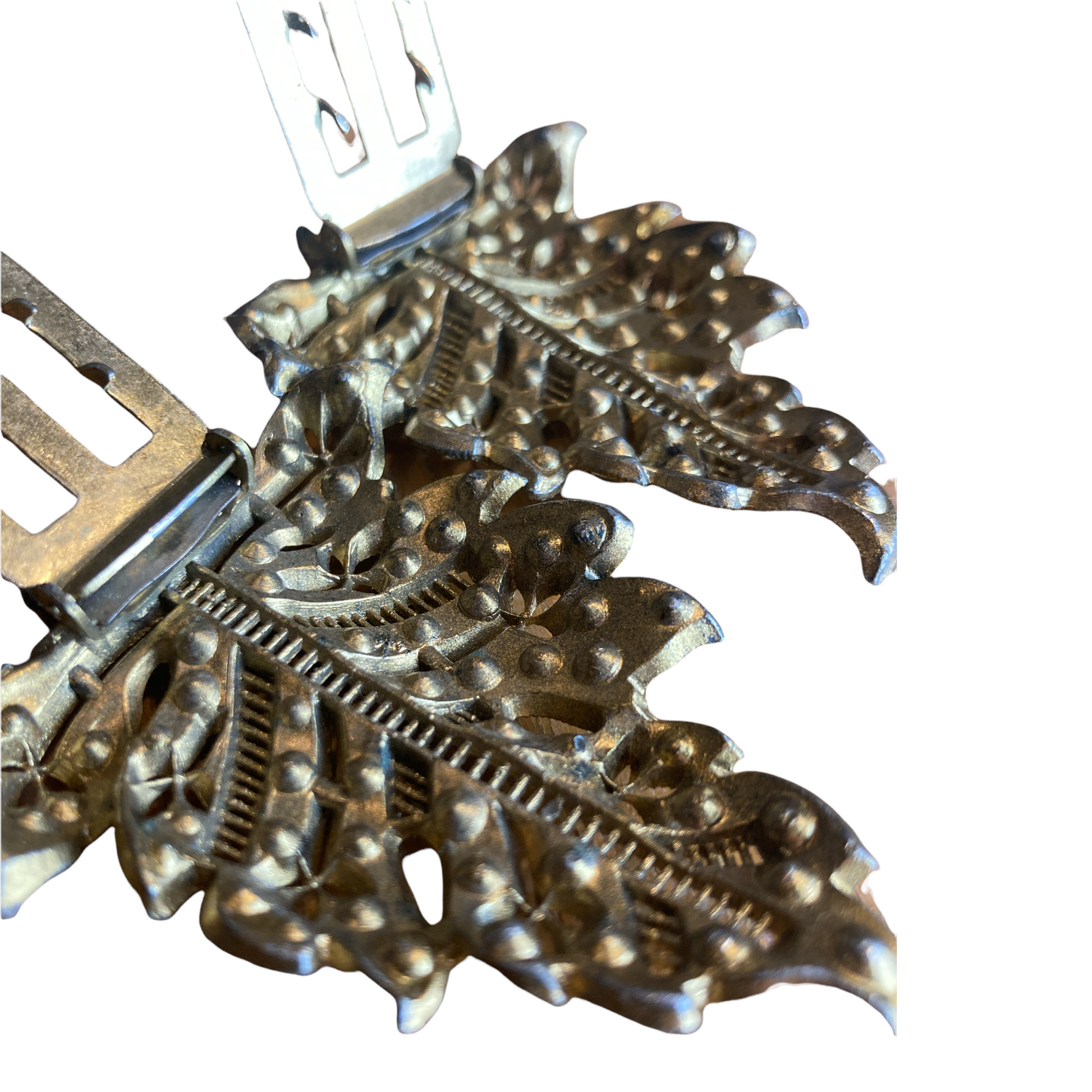 Add some serious fun to your outfit with this vintage antique gold dress clip! With clear rhinestones and an intricate design, it'll add a touch of glamour to any look. Perfect for dressing up a simple outfit, or adding some extra sparkle to a special occasion dress. The options are limitless!!
