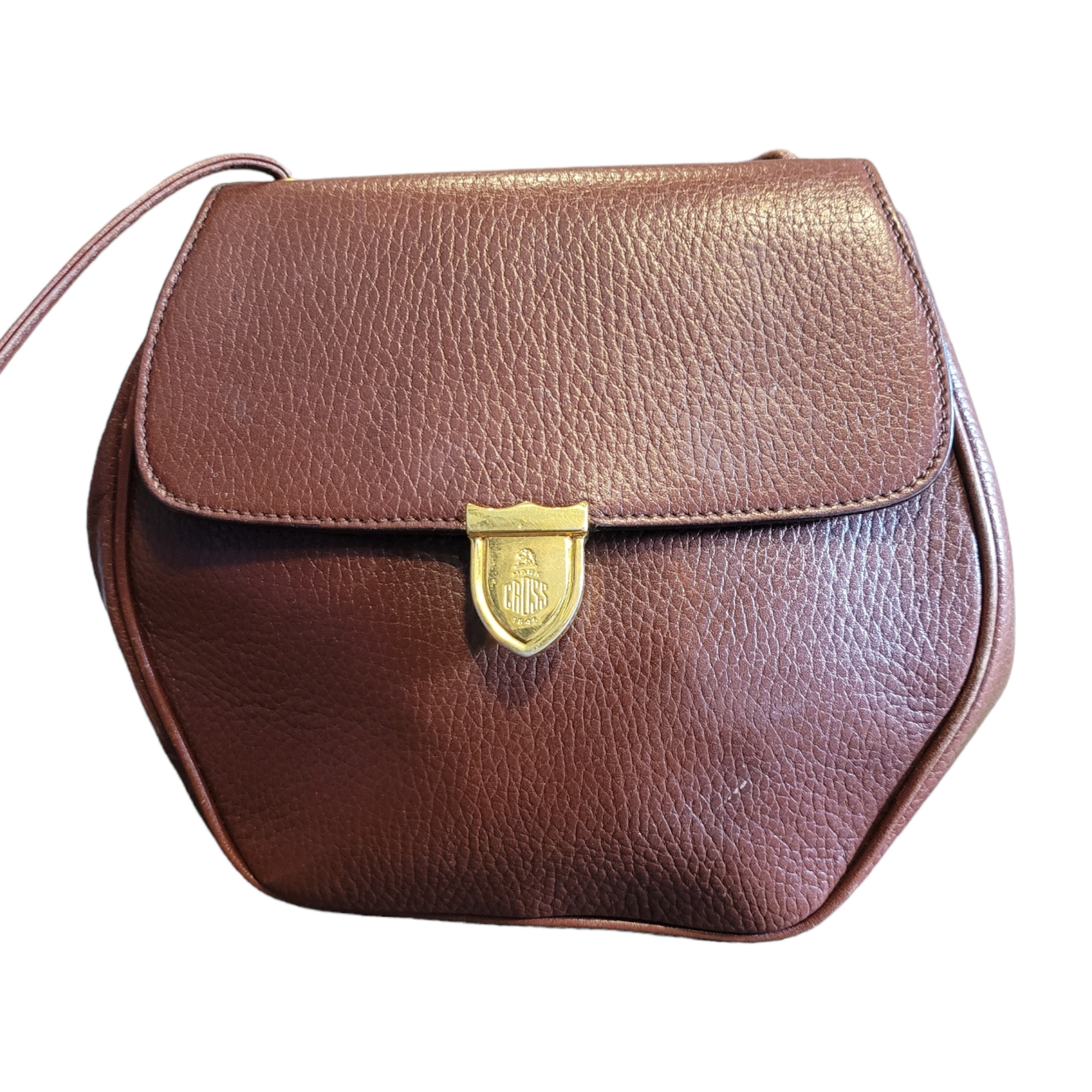 Treat yourself to the ultimate luxury accessory with the Vintage Mark Cross Crossbody Bag. This stunning pebbled leather bag features an unusual octagon shape that sets it apart from the crowd. The rich brown hue adds to its opulent appeal, while the crossbody design ensures both comfort and functionality. As a rare and exquisite vintage find, this bag is the perfect addition to any fashion-lover's collection, exuding timeless elegance and refinement.