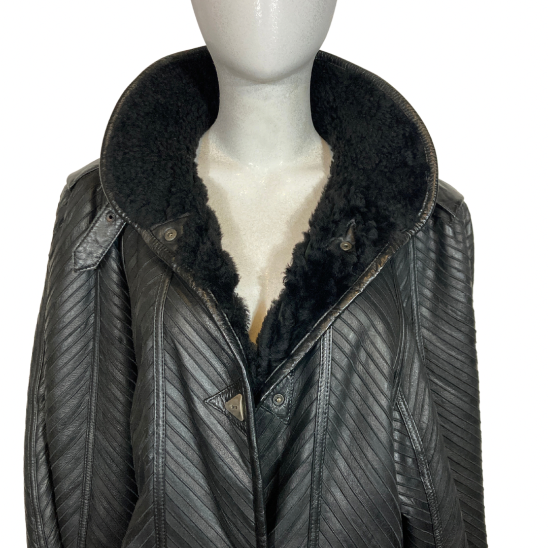 Doing the most in this 80s Issey Miyakeesque epic black pleated/rib stitched leather coat with faux shearling lining, that hits at the ankle! Boast drop shoulders, dolman sleeves, belted collar and sleeves.